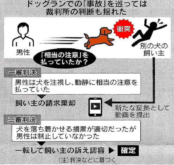 2025-10-26・・・日経より ◆ペット巡る損陪訴訟、犬と激突、怪我3700万円要求 原付がぶつかったほどの衝撃 ドッグラン飼い主責任は? ペットを飼う喜びには責任も伴う。大阪市内のドッグランを訪れた男性は、場内で走り回っていた愛大が別の飼い主に衝突してケガをさせたとして、約3700万円の損害賠償を求めて訴えられた。裁判では飼い犬に十分な注意を払っていたため賠償責任はないと反論。犬たちの戯れが招いた争いに、裁判所の判断も揺れた。2021年2月、テニスコート3面ほどのドツグランに愛大家たちが集まっていた。 大型犬コーナーにいたのは4~5組の利用者。普段はリードの外れることのない大たちが解き放たれ、ここぞとばかりに跳ね回る。男性は9カ月前から体高約50cm、体重約28kgのゴールデンレトリバーを飼っていた。しつけのために訓練学校に2 ~3 カ月通わせ、言うことをよく聞くようになった。ドッグランにも既に3回ほど通っていた。「おとなしい性格で喧嘩もしない」。温厚さが自慢だったが、この日は様子が違った。活発に走り回り、 一回り小さめの大を追いかけ回し始めた。 ついには勢いそのまま場内にいたその犬の飼い主に後ろから衝突。左脚にぶつかられて転倒し、地面に転がった飼い主は「原付きがぶつかったんかな」と思うほどの衝撃だったという。男性が慌てて駆け寄ると、飼い主は「大丈夫です」と応じた。お互い犬好きどうしその場はなごやかに収まったが、飼い主はその後に訪れた病院で左脚や肩の捻挫が判明する。一肩は可動域が狭まったまま後遺症が残ると診断された。 「興奮させすぎない!」「飼い主がコントロールできない状態での入場はNG」。ドッグランの施設に張り紙がされていたにもかかわらず、男性が飼い犬を興奮状態で入場させたのは「過失」だと飼い主側は主張した。後遺症がなければ将来得られたはずの逸失利益や治療費などの支払いを求め、2023年3月に男性を提訴した。訴えられた男性側は裁判で争った。そもそもドッグランは街中で散歩をさせる状況と違い、リードを外して走り回ることが許されていると強調した。 場内では飼い大を監視しており、払うべき注意としては十分だったとして賠償責任は負わないと反論した。ペットとして大の人気は根強い。 一般社団法人ペットフード協会(東京・千代田)によると、2024年の大の飼育頭数は約679万頭。猫の人気に押されて減少はしているものの、飼育世帯数は全世帯の1割に近い。ドッグランの利用も広がっている。ペット保険「PS保険」を提供するペットメディカルサポート(同・港)が24年4月に実施した調査によると、犬の飼い主875人の4割以上に利用経験があった。 一方で「(自身の犬が)ほかの大から危害を加えられた」とするトラブル経験者も2割いた。民法718条は「動物の占有者は、その動物が他人に加えた損害を賠償する責任を負う。ただし、動物の種類及び性質に従い相当の注意をもってその管理をしたときは、この限りでない」と規定している。裁判ではペットの占有者である男性が「相当の注意」をもっていたと言えるかどうかが争点になった。 ●注視 一審・神戸地裁尼崎支部は男性側の反論を認めた。男性がリードを持ったまま数m程度の距離にいて犬を注視しており「動静について相当の注意を払っていたと認められる」と判断した。逆にケガをした飼い主側は、大が走り回ることが予見できるギッグラン内に立ち、大の動静を注視して衝突を避けるべき義務を負っていたのに視線を切らしていたと指摘し、請求を棄却した。ところが、飼い主側の控訴を受けた二審。 大阪高裁は25年6月、 一転して男性側の賠償責任を認めた。男性の大が相手の大を追いかけ回していた状況から、ドッグランであってもリードをつけたり一時的に退場させたりして遊びに夢中な状態から落ち着かせるといった措置が適切だったと断じた。男性に「おいで」や「とまれ」などと命令で制止しようとする行動もうかわれず「通常払うべき程度の注意義務を尽くしていたとは認められない」として約1600万円の支払いを命じた。 判断の決め手になったとみられるのが、飼い主側が控訴審で新たに証拠として提出した動画だ。妻のスマートフォンを見返したところ、事故当日の動画が見つかったという。事故の直前、男性がリードから手を放し、棒立ちで大たちが走り回るのを眺めている様子が映っていた。男性側は敗訴を受け入れ、判決は確定した。 専用の保険には入っていなかったが、自動車保険の特約でカバーされたという。拘束から解き放たれ、自由に過ごせる非日常的な空間に高揚するのは人も大も同じだろう。事故を起こしたペットに悪気があったわけでもない。大も走れば人に当たる。限られた柵の中でも愛犬を見守り、必要なときはしっかり制御することも飼う側の責務だ。(木宮純)