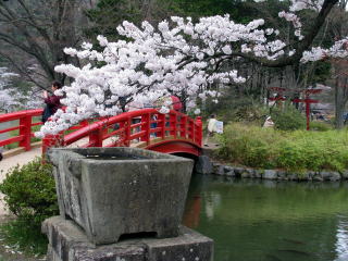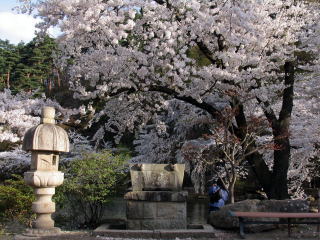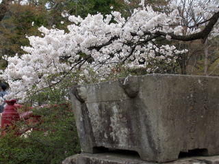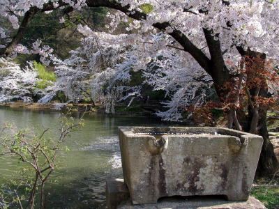 桜と手水石