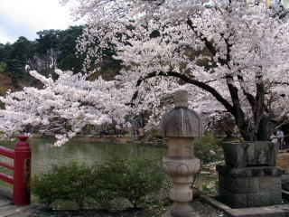 手水石に桜のコンビ