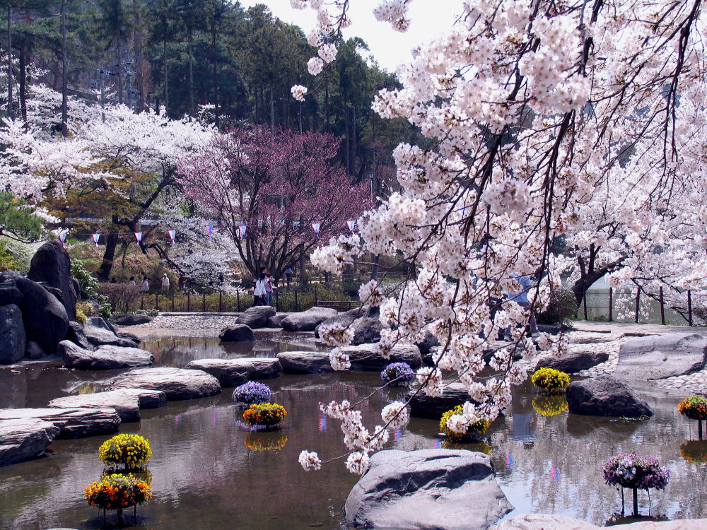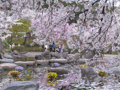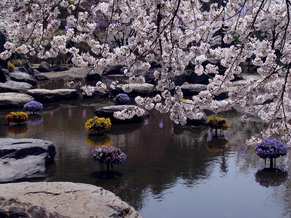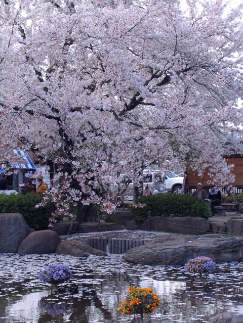 臥竜公園入口を入って直ぐ左側の浅瀬の小さな池 2009-02-5~ 須坂市臥竜公園入口(正面入口)の駐車場から直線通りに入って直ぐ左側にある小さな庭園付きの小さな池がある。その右手には竜ケ池に浮かぶあずまやが立てられている。本多静六博士の[臥龍山公園設計図]によると龍の池(現在は竜ケ池)としていたので、その小さな池を小生は竜の小池(龍の小池)と呼んでいるが、これは仮名です。少し昔は沼地のようになっていて菖蒲や花菖蒲等が植えられていた。現在は池の底はコンクリートで固められていて寂しい竜の小池である。 ※載せている写真は他のページにもダブって載っている場合もあります。 春になるとこの竜の小池に水が張られていない時は花見の宴会場に早変わりしている。竜の小池の回りは桜の花に囲まれていて誠に美しく一杯飲みたくなるような気分を誘う所である。