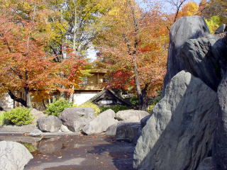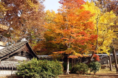 須坂藩詰所に使われていた瓦屋根の隣に紅葉の木と銀杏の木がコントラスト良く植えられて秋を演出していた。
