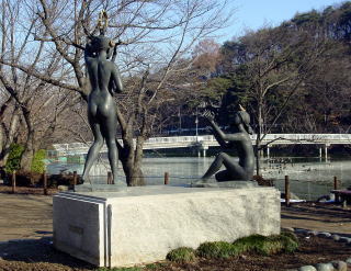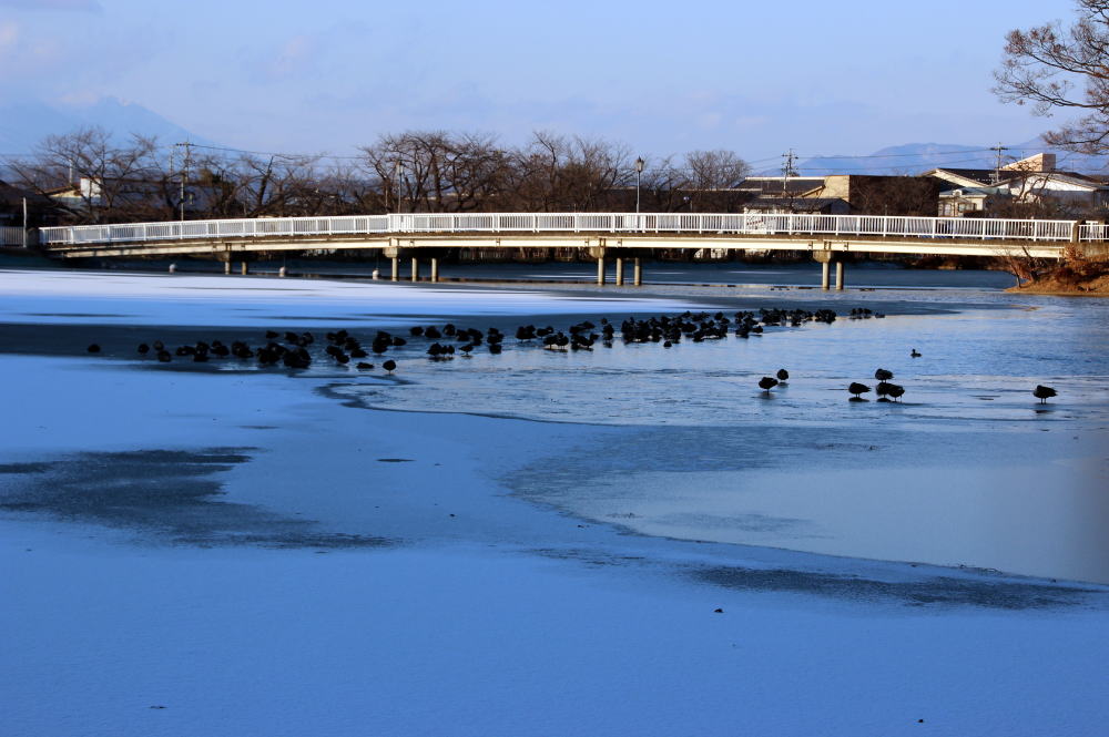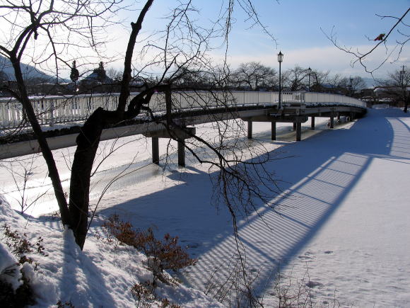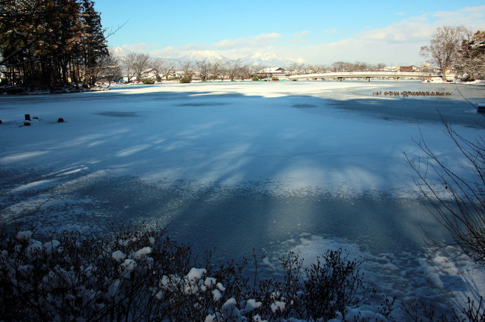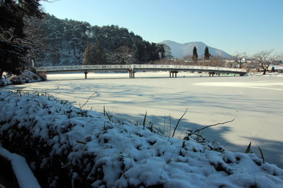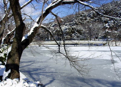冬は竜ケ池にも雪が降って白い原野のようになって橋を歩けば寒いながらも素晴らしい景色を見せてくれます。