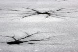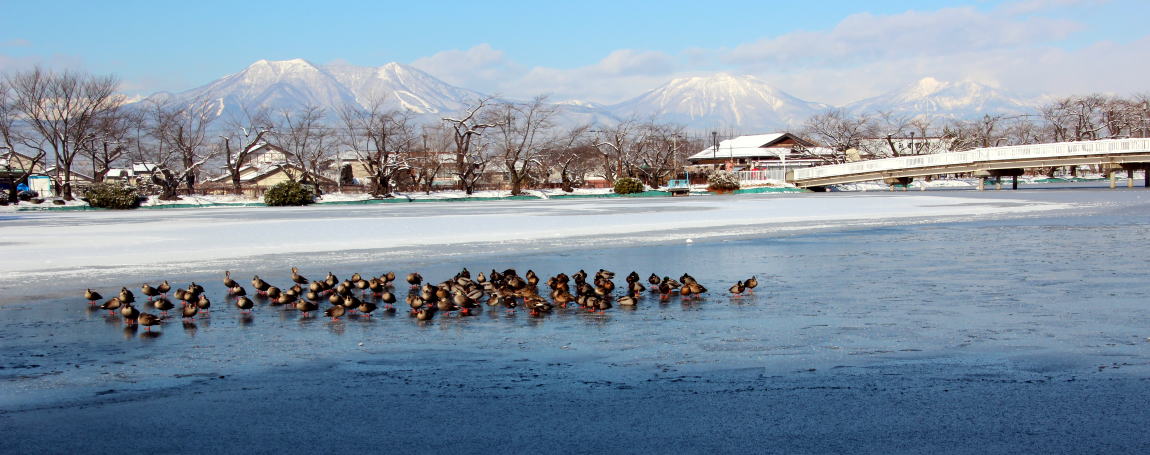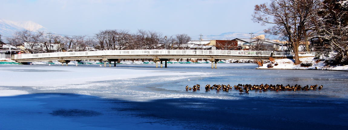 臥竜公園のシンボル的な竜ケ池(龍の池) 2012-01-10 正月に臥竜公園へと出かけた。小生は龍ケ池一周 約840mは歩数計1123歩であった。殆ど水の流れを感じさせない水面に雪によめ氷が張りめぐらされている。鴨たちは冷たい龍ケ池の凍っていない日当たりの良い所に屯していた。 鴨たちは殆ど同じ方向を向き時を過ごしているようであった。冷たい池面で何を語り合っているのだろう。風に囁いているのだろうか。寂しさを集団で癒しているのだろうか。寒風と恵みの日の光を浴びて過ごす鴨に これが自然界の定めと生きるものの掟と知りつつ臥竜公園の池畔を歩いた。
