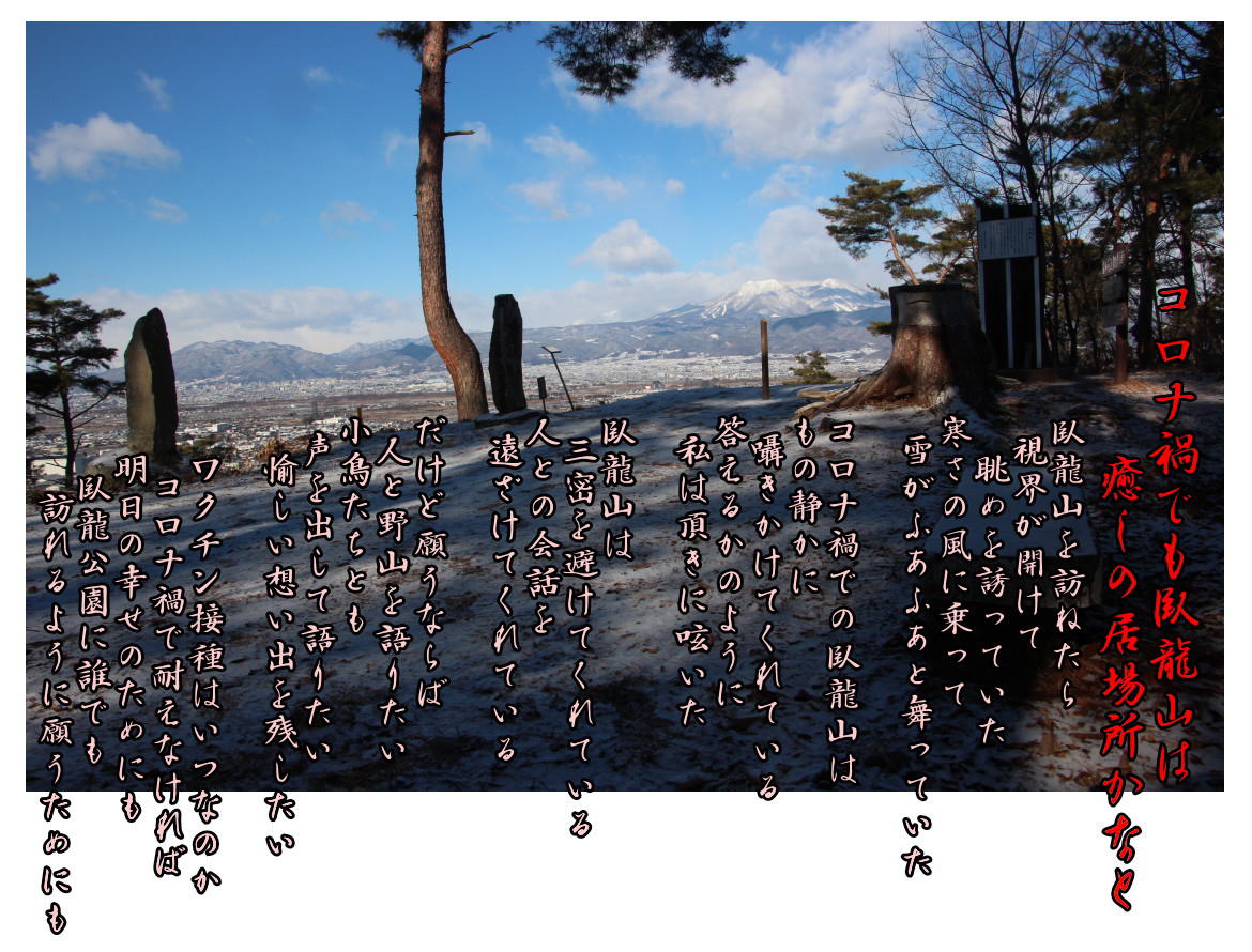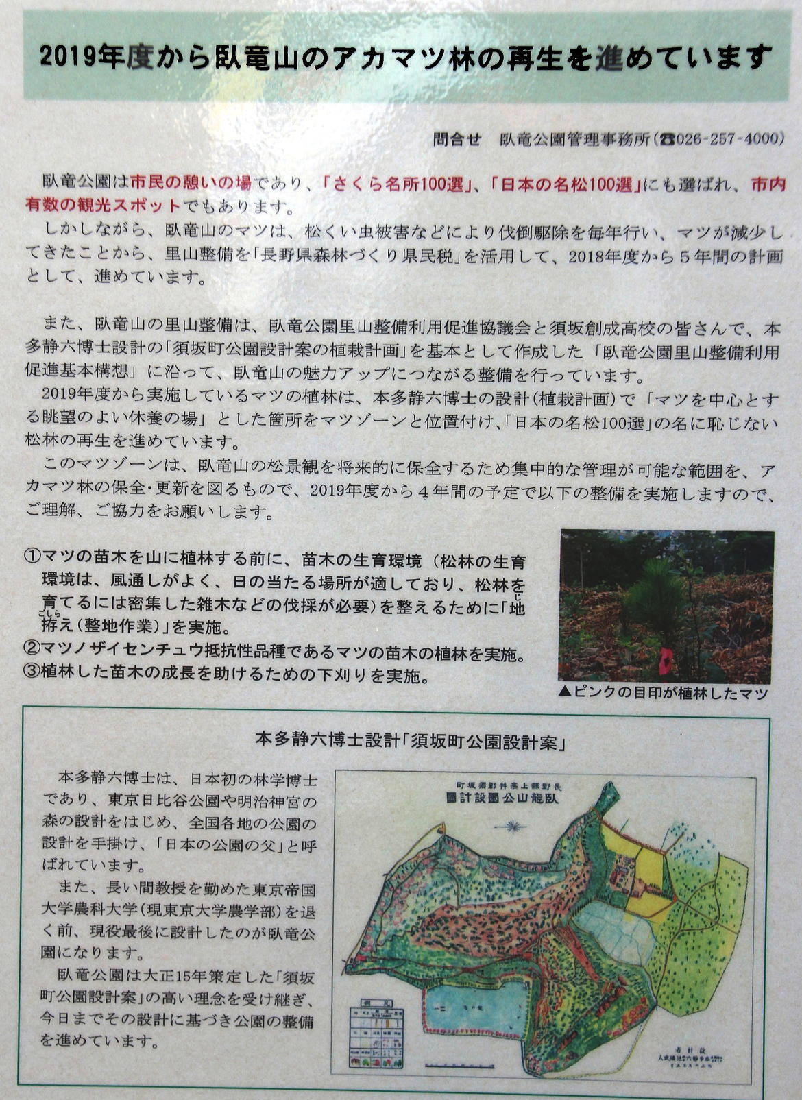運動のつもりでなんとなく臥龍山に登ったら山頂付近の木々が切られて視界が開けていた。見晴らしを良くしたのかなと思っていたが、地面のいたるところに苗木の松が何百本と植えられていた。須坂市で、こんなに臥龍山の整備にお金をかける余裕があるなら「コロナ感染」対策にお金をかけるべきではないだろうか?。
