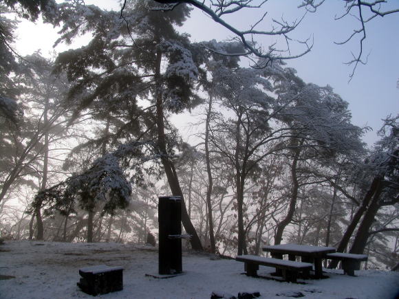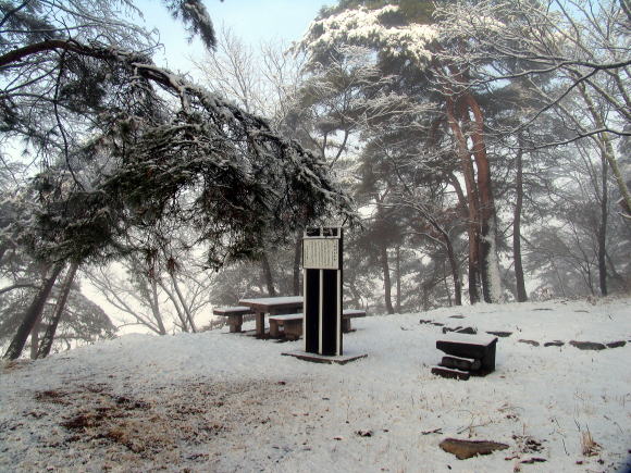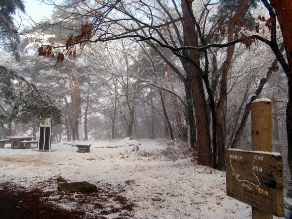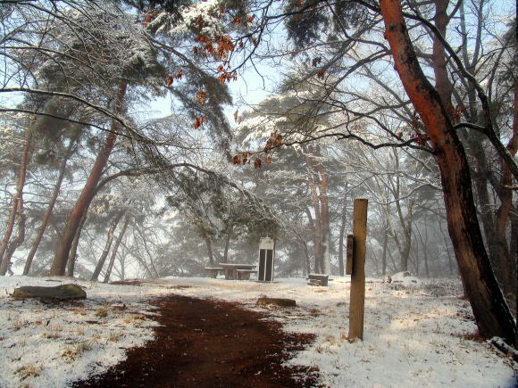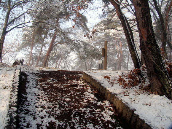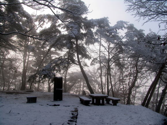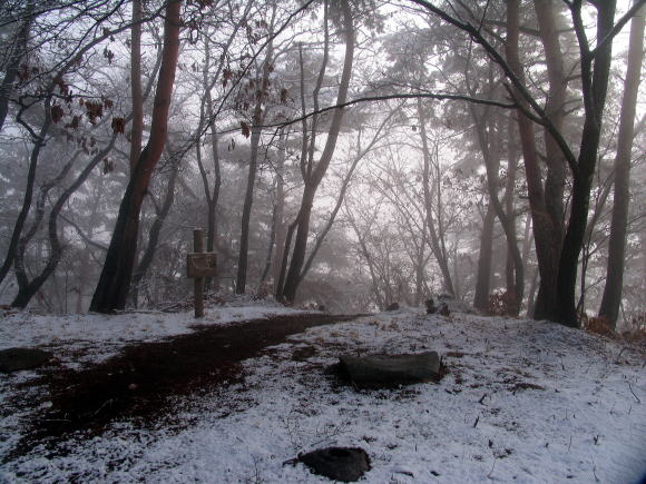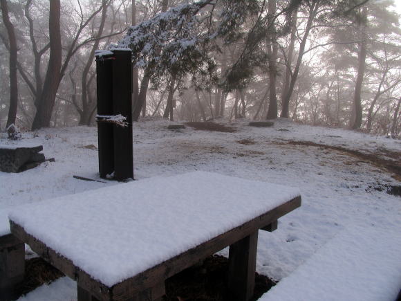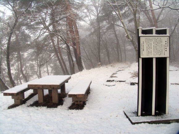 うっすらと雪化粧した須田城址山(須田城跡)に登った。素晴らしい朝の光景が目に焼きついた。
