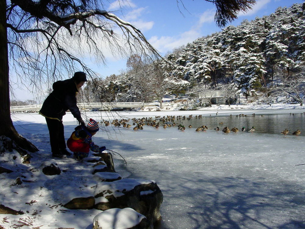 久々に臥竜公園の竜ヶ池の回りを散歩しながら写真を撮りながら弁天島に渡ろうとしていた時、お婆ちゃんと孫娘も後から渡ってきた。 お婆ちゃんと孫娘は島の淵で鳩や鴨に見入っていた。孫娘とお婆さんと、僅かな会話をしながら一時を過ごした。
