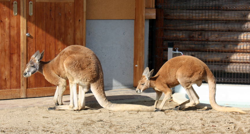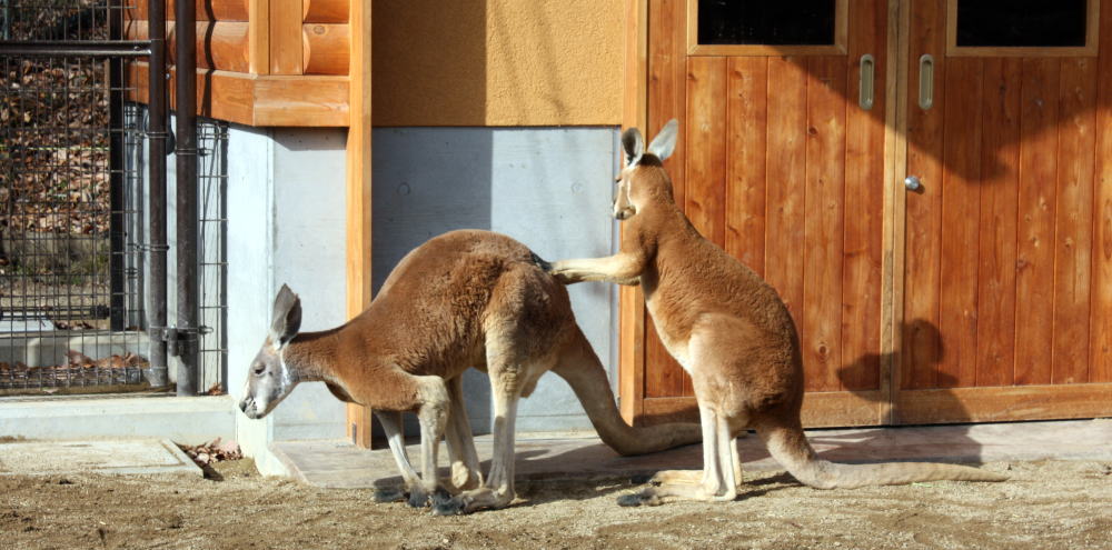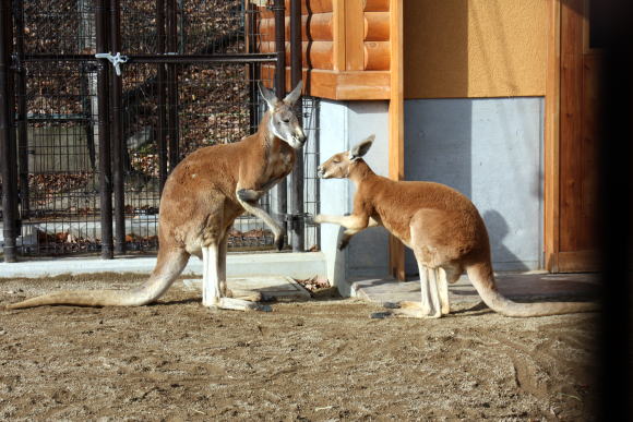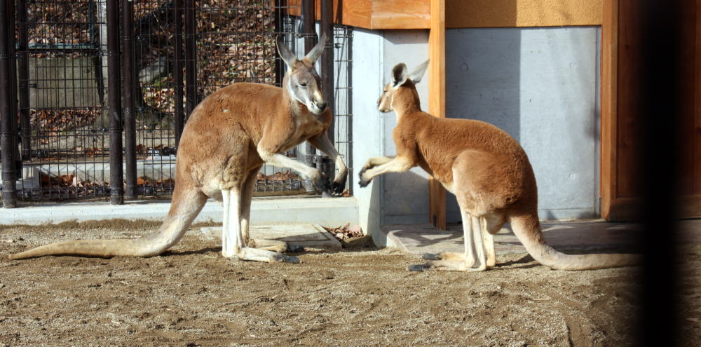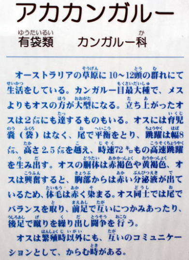 ★資料による 内陸部が広いオーストラリアの景観の美しい草原や芸術的な絵となる荒れ地帯を好んで生息し草を主食としている。自然庭園のような荒れた岩が点在する環境で集団生活をする。雨雲が欲しくなる雨量の少ない昼間では直射日光を避け木陰などで休む。特徴のある足で草原帯などを走るスピードは時速は約50kmぐらいでその光景は印象的である。 特徴のある長い足を利用して跳躍力はかなり強く10mぐらいは跳ねるとか。アカカンガルーはかなりの頭数で群れをなしてあちらこちらへと動き集団生活する。砂漠地帯の熱さから身を守るために手首を舐めさすったりして体温を低下させ皮膚の保護をしている。群れの中で強さを誇示する為に時々オス同士の闘争では前肢で引っ掻き後肢で蹴りを繰り出しキックボクシングのようなことをする。 アカカンガルーは繁殖しやすく、環境さえ良ければ毎年のように一回に一頭を産んで妊娠期間は30~40日間である。子は自力で嚢中(のう)まで移動し、生れてから8ケ月間は母親の育児嚢(のう)の中でのんびりと生活して世間の素晴らしく危険な草地を踏む。棲息地では生息数が増えつつあり交通事故などの問題を起こし棲息地での今後の対応が問われている。