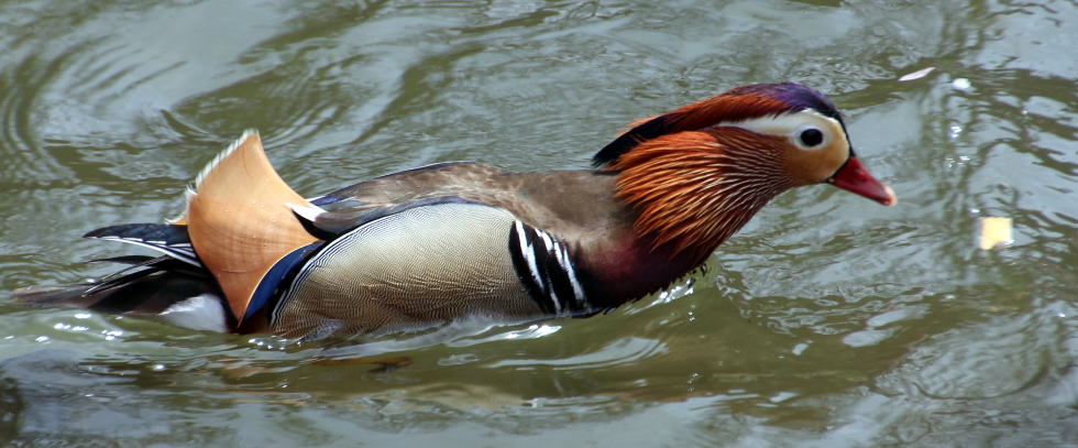 臥竜公園の弁天橋に来たら鯉などに餌を投げていた。よく見ると一羽だけオシドリがいた。目立った模様なので早速パチパチと写真を撮った。後日に竜ケ池に来たがオシドリは見つからなかった。