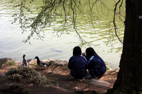 ねえねえ うまく撮れる どうこんな感じで・・・ うんん、まあまあね・・・ 鴨さん、動かないで止まって 俺たちを撮ろうってさ 何処が良いんだろうかな まあ好きに撮らせてやるさ 鴨さん、ペチャペチャ話しててさ どうも構図が良くないなあ でもさー、仲の良い鴨さんだね 私達みたいに、意気があっているかな 何だかんだと、ペラペラ喋っているな まあいいじゃないの ちょっと話しかけてみようか ![]() よお、うまく撮れそうかな うーん難しくてね・・・・ 数撮れば一枚ぐらい様になるのでは はーい、パチリ---撮ったあ! よかったなあー もう一枚・・・・・ どうやって撮る 鴨さん、ポーズとってね おいおい、さいそくするなよ 俺たちの自然体で撮れよ そうね、さあー撮るよ そらそら・・・・・撮ったよ 良い出来ね 鴨さん見てみて どれどれ、見てあげよう うーむ、間違いなく鴨だなあ 今度は君たちを撮ってあげようか 撮るって、だって手がないじゃん 撮れっこないよ そう言うな、ちゃんと撮れるから そーれポーズして よーし撮ったぞ 君たち、見たいかな うん見たい カメラも持たずにどう映ったのかな 鴨さん、私もみたいな 鴨の私の目を良く見な 君たちが映っているだろう これが君たちの映った写真さ ![]() 鴨達と少女達の心の会話 映った写真は夢の絆 ここだけの内緒の出来事にしようね またいつか弁天島の池畔で 秘密の園で、会おうよ・・・・・ 鴨さんと少女の心温まる小さな物語でした |