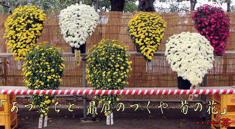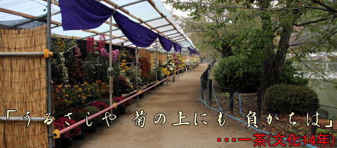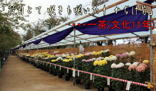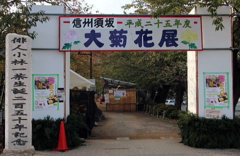 10月25日~11月11(月)まで、菊祭り称して、第26回、信州須坂大菊花展を須坂市臥竜公園内で行われている。丹精込めて手入れをされた菊500~600鉢の出品されて、その会場内に、それに便乗して「生誕250年記念」として、松尾芭蕉・蕪村と並ぶ近世俳諧史上の三尊にまで祀り上げる俳人小林一茶の菊に関する俳句は四百近くも詠まれている中の約16句だけを所々に貼って紹介していた。小生も菊花展に俳人小林一茶記念に彩かって拙く独自なニアンスで俳句を詠んでみました。
