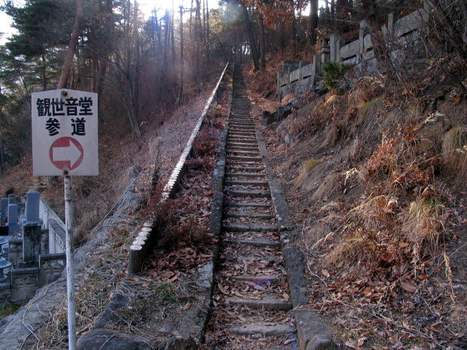 南の興国寺側(テニスコート・駐車場)から歩いて、観世音橋の手前左に[観世音堂参道⇒]の標識が立っている。そこの階段を112段登って右へ曲がって25段登ると、そこは聖観世音菩薩堂(しょうかんのんぼさつどう)である。