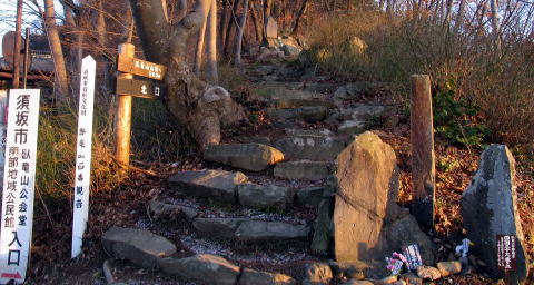 ◆北口登山道、登口付近の主な臥竜山百番観世音様[1] 須坂市臥竜公園入り口から左への車道をほんの少し歩くと目前に下の写真の場所に着きます。ここが臥竜山山頂への北口登山道出発地点です。ここからの山頂への歩道には多くの臥竜山百番観世音様が沢山あります。 [1] 入口から西国26-1 西国29-2 西国12-2 板東9 西国25 [2] 西国32-2 秩父19-2 秩父24 西国24 板東10 秩父2-2