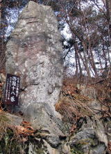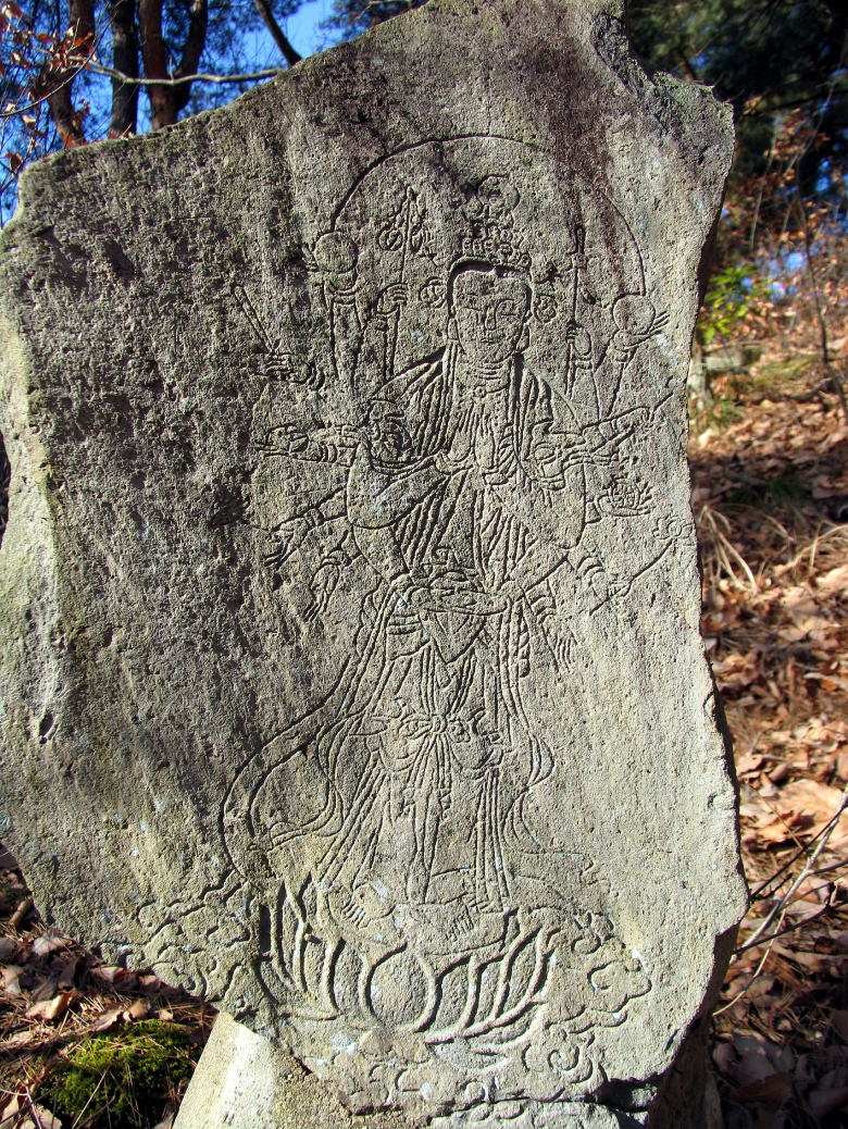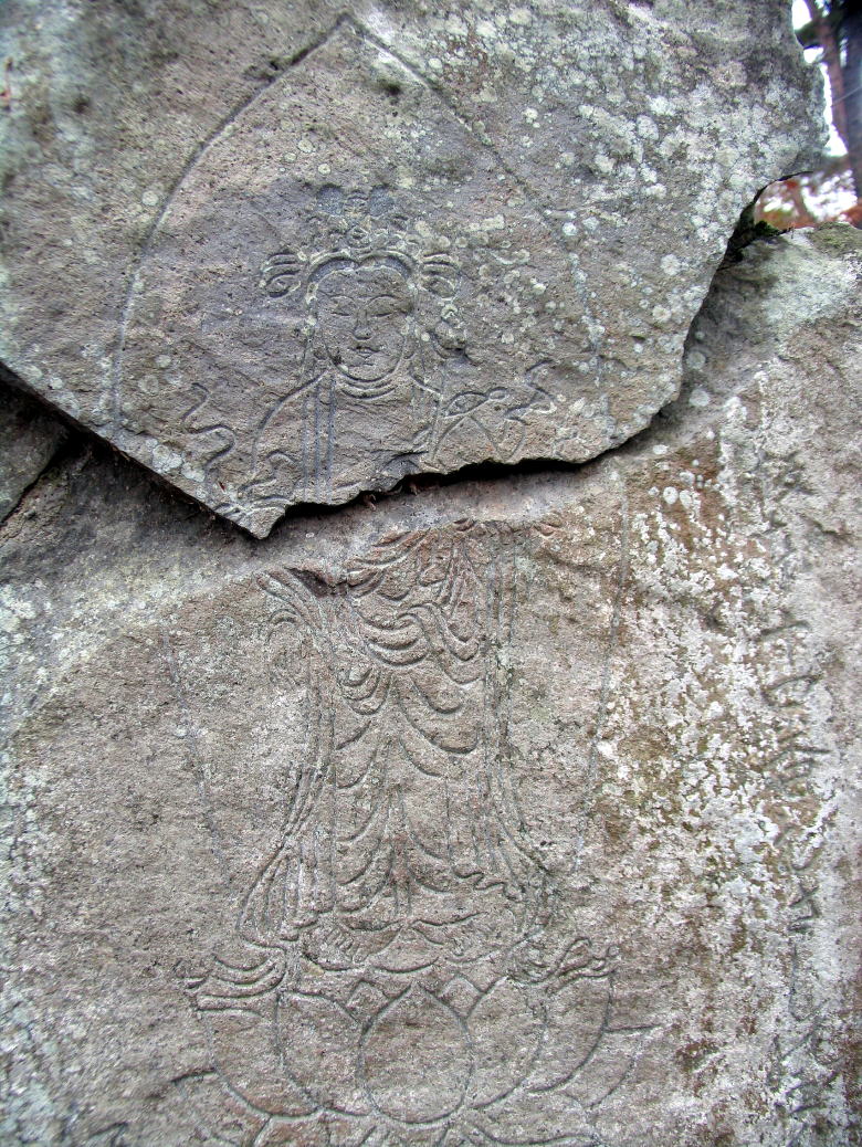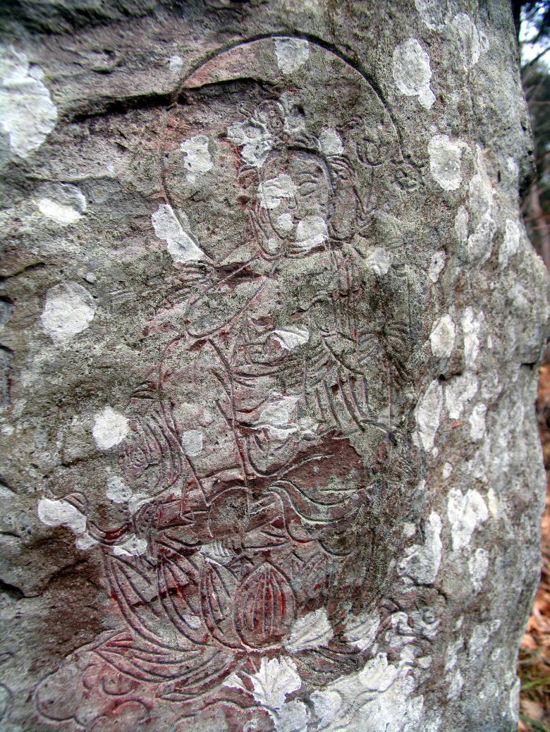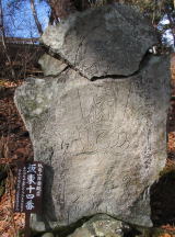 聖観世音菩薩堂の正面から左手に石段があります。ここを下って左へカーブする所を右への踏み跡に入ります。目の前当たりに西国20(欠け)と板東14(欠け)が見えます。少し下って右へトラバースしますと板東15-1(欠け)・西国19(頭部欠け)・西国18・板東16(欠け)があります。この辺りの百番観世音は欠けているものが多いです。