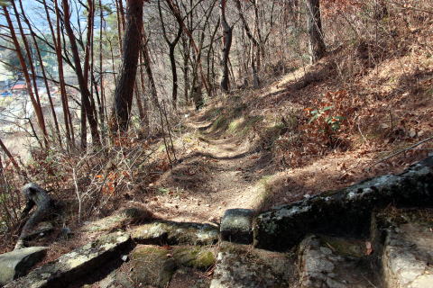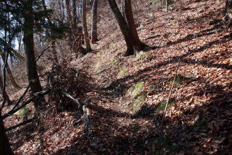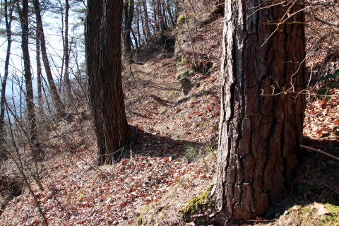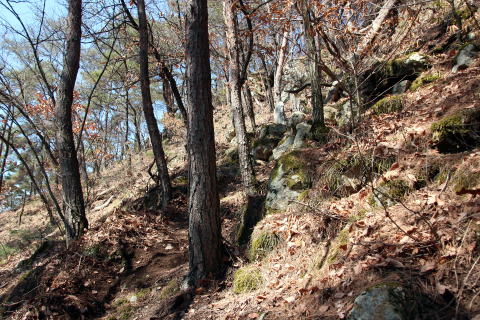 秘境の岩場への登り道、葉が繁れば寂しさが漂う観音道なのかな
