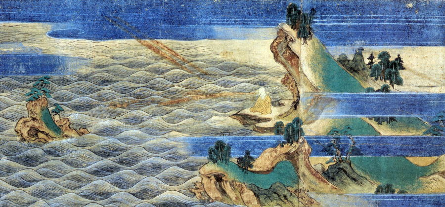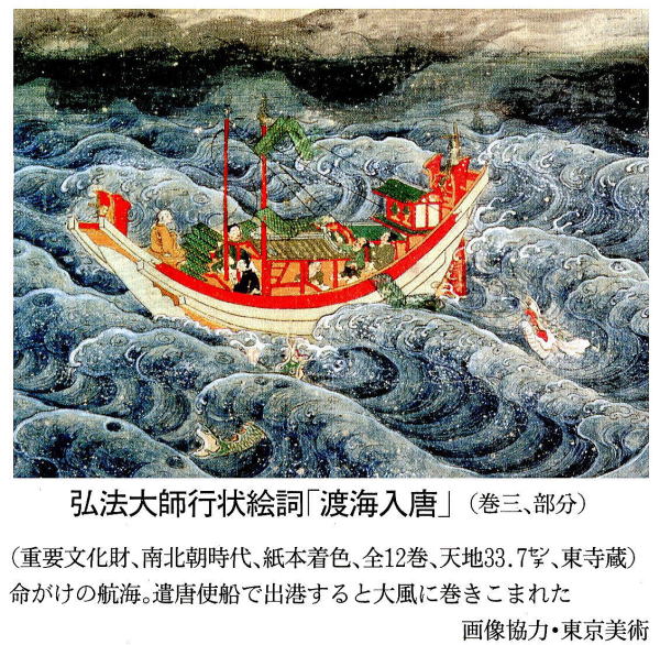 「空海は明けの明星を窓口に宇傍観そのものをみていたでしょう」空海が開いたとされる金剛頂等(室戸市)の住職、坂井智宏さんがやはり修行地のひとつ不動岩で口を開いた。このページの写真にあるとおりの岩場だ。「金星の光は海面に映って走ってくる。空海は波打ち際で、宇宙に生かされていると感じたはずです」弘法大師として信仰の対象となった空海は時とともに神格化され、数々の伝説に包まれる。このページの絵巻も中世説話として描かれた。場面は大滝嶽をへて室戸にいたったところ。 詞書によれば、大滝嶽では宝剣が飛び、室戸では明星が口の中に入る。空海の事跡にくわしい坂井さんもこれにはとりあわないが、神秘体験はあったとみる。「日本古来の自然信仰が空海にも流れていたでしょう」唐の長安で当時最新の仏教(密教)を伝授された空海の思想体系は、むろんのこと巨大だ。インドで深化した最終形の教えは余りに深遠で、あとを継ぐ者が容易にくみとれなかったともいわれる。仏教美術を研究する慶応大教授の林温さんによると、その哲理は大きすぎて日本人が着こなせないほど。 が、林さんは同時に「表層的な観念を捨て、ありのままの実相を見る」という空海の態度こそ日本の芸術に共通するものだと考える。引き合いに出されたのは、俳語を大成した松尾芭蕉の一文。「西行の和歌における、宗祇の連歌における、雪舟の絵における、利休が茶における、その貫道するものは一なり」 (「笈の小文」)。現れる形は違っても同じ心が流れている……。空海の足跡をたどって、西行は庵を結んだ。西行の面影を慕って、芭蕉は旅に出た。大自然の中で俗世のくもりを脱し、実相を見すえる。この国の美の核心は、心から心へと手渡されてきたのではなかったか。 ◆自然をありのままに見る 身体と世界が一体になる