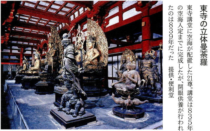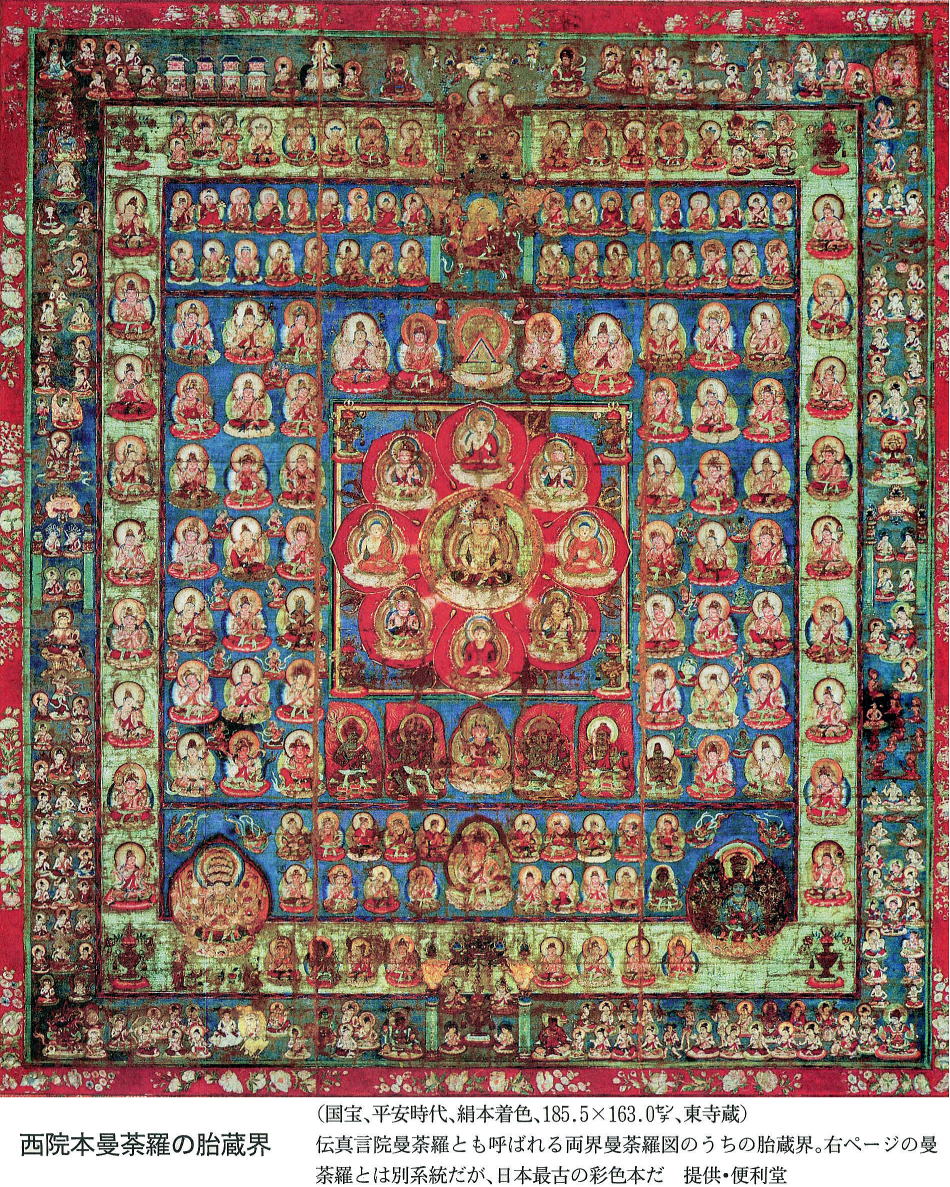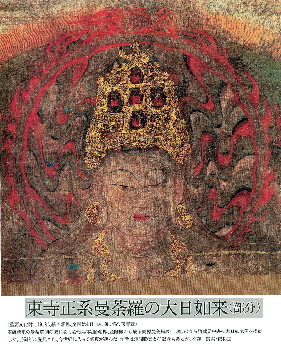 曼茶羅と書いて、マンダラと読む。その絵図は宇宙のイメージを表す極彩色の世界だ。空海は生命力あふれる美を大陸から持ちこみ、色の霊感を伝えた。 なんと気高いお顔だろう。ここに掲げた大日如来の図像を見て、ため息が出た。空海が朝廷から託された密教の根本道場、京都の東寺に伝えられてきた絵だ。宝物館の文化財保護課長、新見康子さんに教えられる。「色のある曼茶羅としては、空海が唐から持ち帰った絵図に最も近い。修理後は東寺で一度公開されたくらいで一般には知られていません‥大師の見た大日如来のお顔がしのばれます」請来品の曼茶羅は残っていない。 が、忠実な模写(高雄曼茶羅)が空海の在留した京都の神護寺にある。傷みが激しいものの、赤外線写真で比類なき描線がいまもたどれる。その転写とみられるのがこの正系曼茶羅(甲本)で、鎌倉時代の初頭に描かれた。実に空海その人につながる図像なのである。発見されたのは戦後の1954年で、宝蔵の解体修理がきっかけ。 今にも粉々になりそうな状態だったのを応急的に修復した。時をへて2000年から4年がかりで本格的な修復がなされ、このように大日如来のお姿が浮かびあがってきたというわけだ。修復を手がけた慶応大教授の林温さんによると、気の遠くなるような作業だった。網の画面は大半が断片になっていたのである。一つひとつ赤外線写真に撮って墨の緑を確認し、そっくりな高尾曼茶羅通りにはりあわせた。「まるでモザイク。 修理者の根性です」尊像から、空海が遣唐使船に乗った9世紀初頭の世界都市、長安がしのばれないだろうか。詩人の李白や杜甫の出た盛唐期の半世紀ほどあと。シルクロードやインド、遠く欧州からも美の息吹がもたらされ、絵師たちが技を競った。林さんの指摘する通り、中国美術の特筆すべき時代であった。「写実的で、西洋的感覚に近いものがこのころの美術にはみられます。肉体のデッサンがすばらしい」。