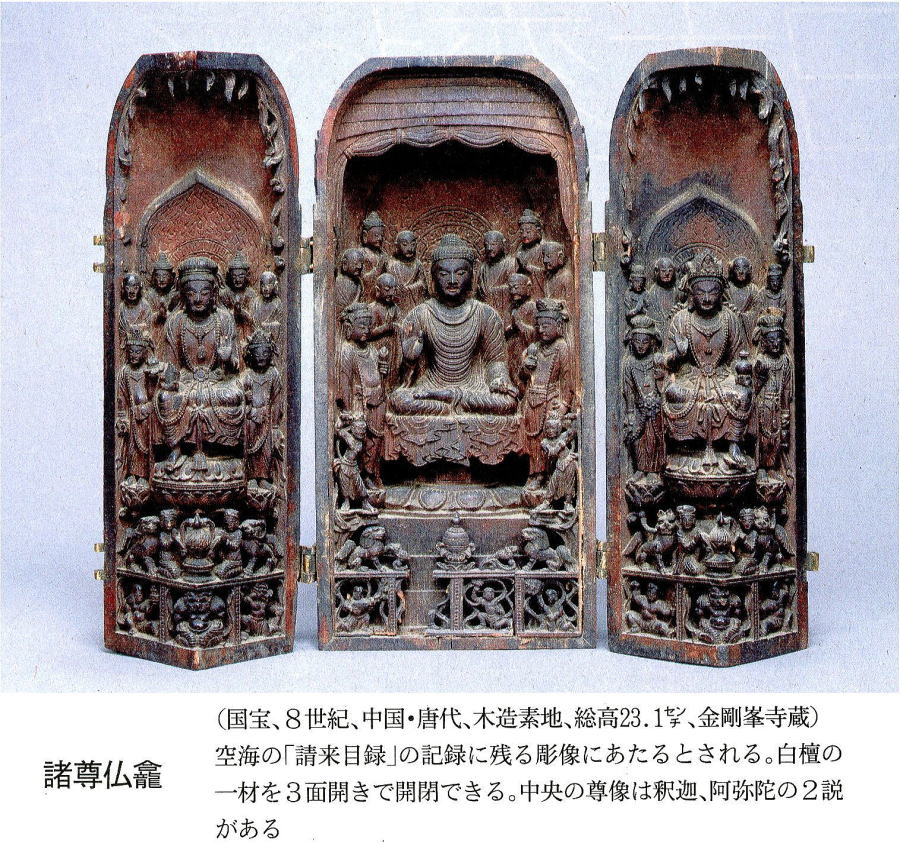 青年期、近畿や四国の山野で荒い修行をかさねた空海が唐に渡ったのは、30代に入ってまもなく。長安でインド僧から南アジアの古代語サンスクリットを学び、次いで密教の本拠地(青龍寺)で恵異という高僧に出会う。密教はインドに発するが、その始祖につらなる法脈の正統な継承者となった。恵異は死後に密教の大法が絶えることをおそれ、日本の英才にそれを授けた。新訳の経や新たに描かせた曼茶羅などが託された。入唐から2年のち、空海は経典とともに曼茶羅や諸尊仏がん(左ページ)をたずさえ、帰国した。 それらの貴重な品々は「請来目録・しょうらいもくろく」という記録に残る。その数、およそ250点。諸尊仏がんもお顔を見れば、なんともエキゾチックだ。密教とは秘密仏教のこと。図像が決定的な力をもつ宗教だった。曼茶羅にくわしい林さんによれば、秘密であるゆえにもっとも大事な部分は文字で表さない。真言(仏の言葉)を唱え、手で印を結び、心にイメージを観想する。そのイメージの源となるのが両界曼茶羅図なのである。曼茶羅はサンスクリットのマンダラにさかのぼる言葉で、本質を有するものといった意がある。 女性が胎内で命をはぐくむように悟りの理を示す胎蔵界。憤りの智恵の働きを表す金剛界。理と智、ふたつの曼茶羅が表裏一体となる世界だ。両界曼茶羅図は宇宙の根源である大日如来の深遠な働きを現し、その前で瞑想することがなにより大切な修法となる。真理は絵図によってしか伝えられない。恵果はそう空海に力説したという。空海は長安の寺院で、日本で見ることのない圧倒的な絵画や彫刻にふれ、まさに心を震わせたことだろう。かの高雄曼茶羅には名にしおう唐の宮廷画家、李真の様式が認められるという。 オリジナルは長安でも屈指の画家の筆によるものだったはずだ。密教の本質は、図像から図像へと美の力によって伝えられただろう。日本でのちにおこる禅宗は色を否定する。空海の宗教はその反対だった。「密教は色を重んじ、リアルな造形にこだわった」 (林さん)浮世絵のように鮮やかな色で、生命の力を画面にみなぎらせる。わび、さびで語られることの多い日本の美意識の源流には、そんな生の美術も秘められていたのではなかったか。