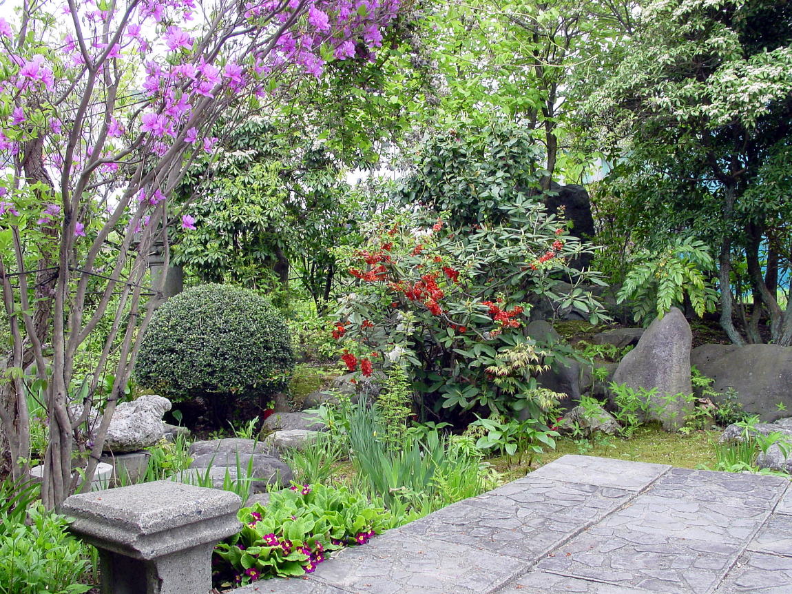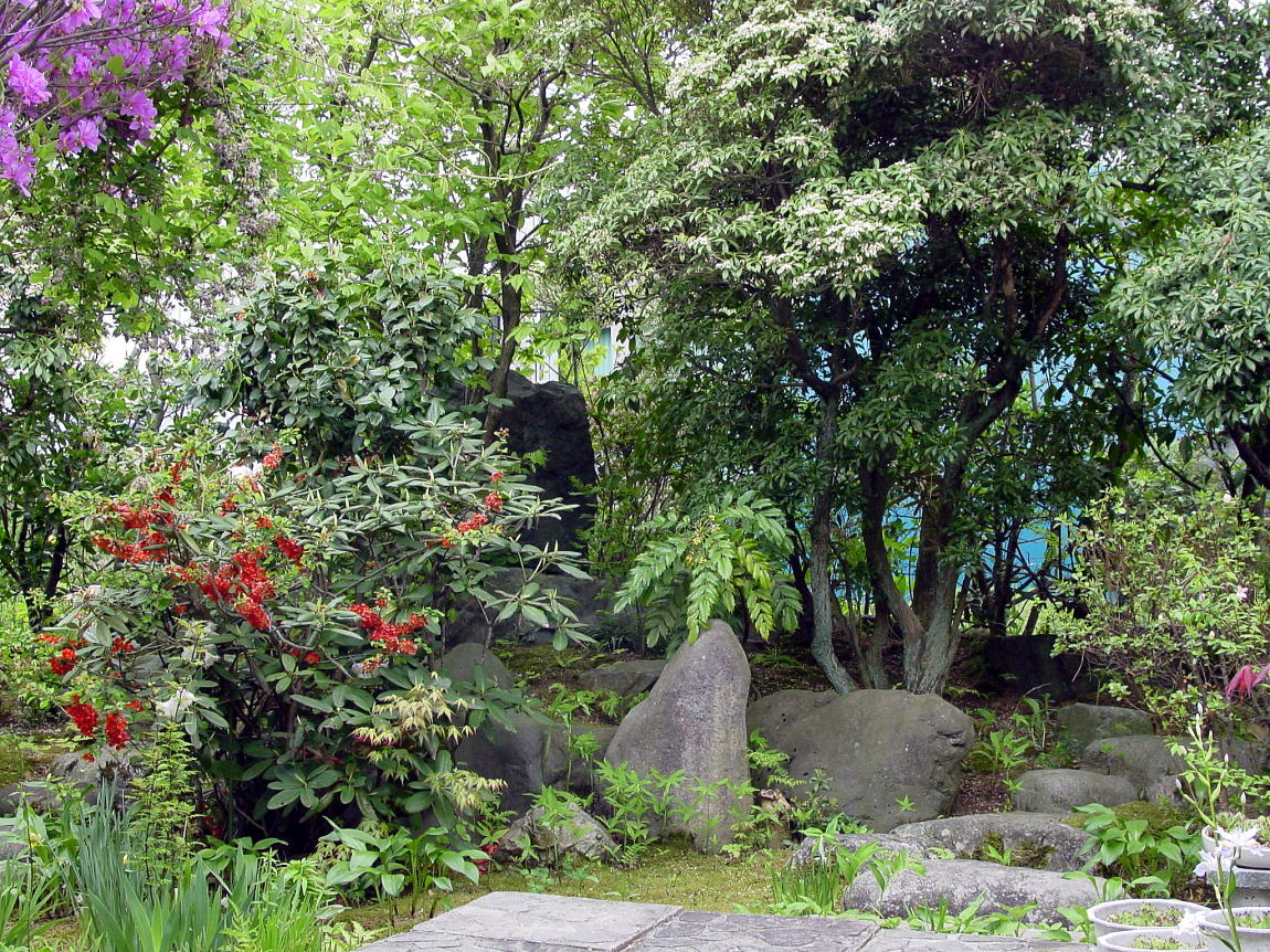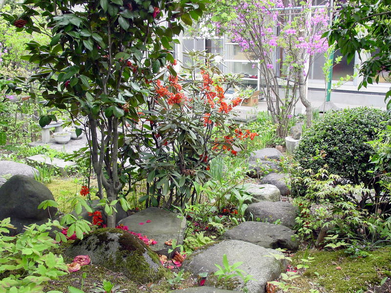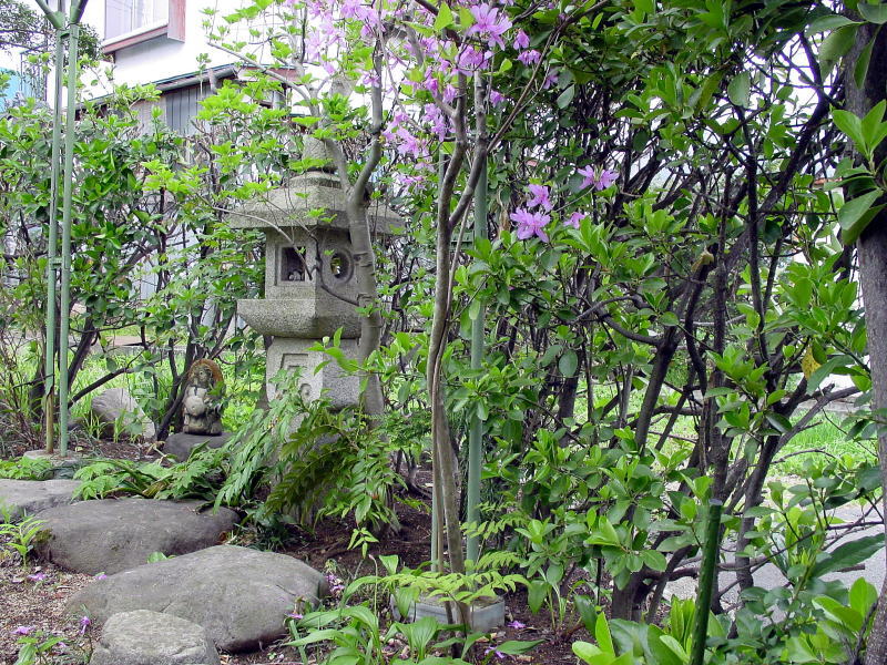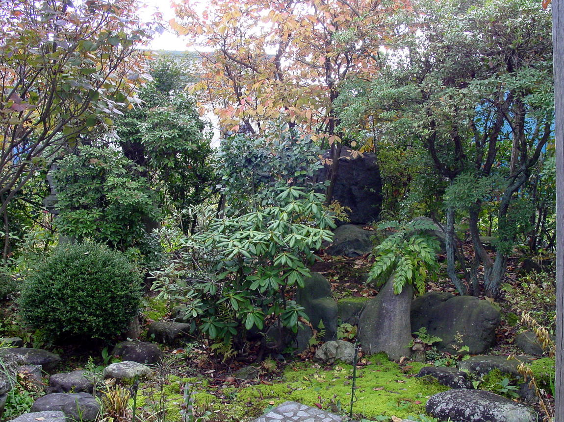 庭に踏み石(約260個)を路地風に配置して、庭の中心に雌松を 左右に雄松を植えて、苔を敷きつめて灯籠などを配置して武家好みの庭にしたが25年もしたらモミジや雌松は枯れてしまった。2mぐらいのミズキを植えたが15mに大きくなり過ぎて切ったり市道の工事の為庭木を移動したりして庭の形が崩れてしまった。