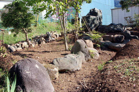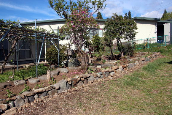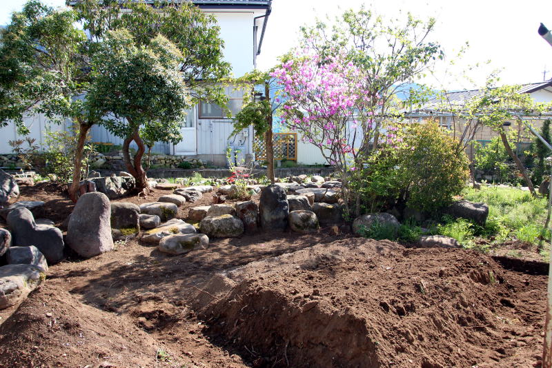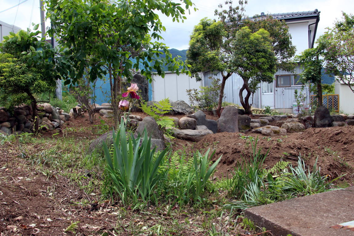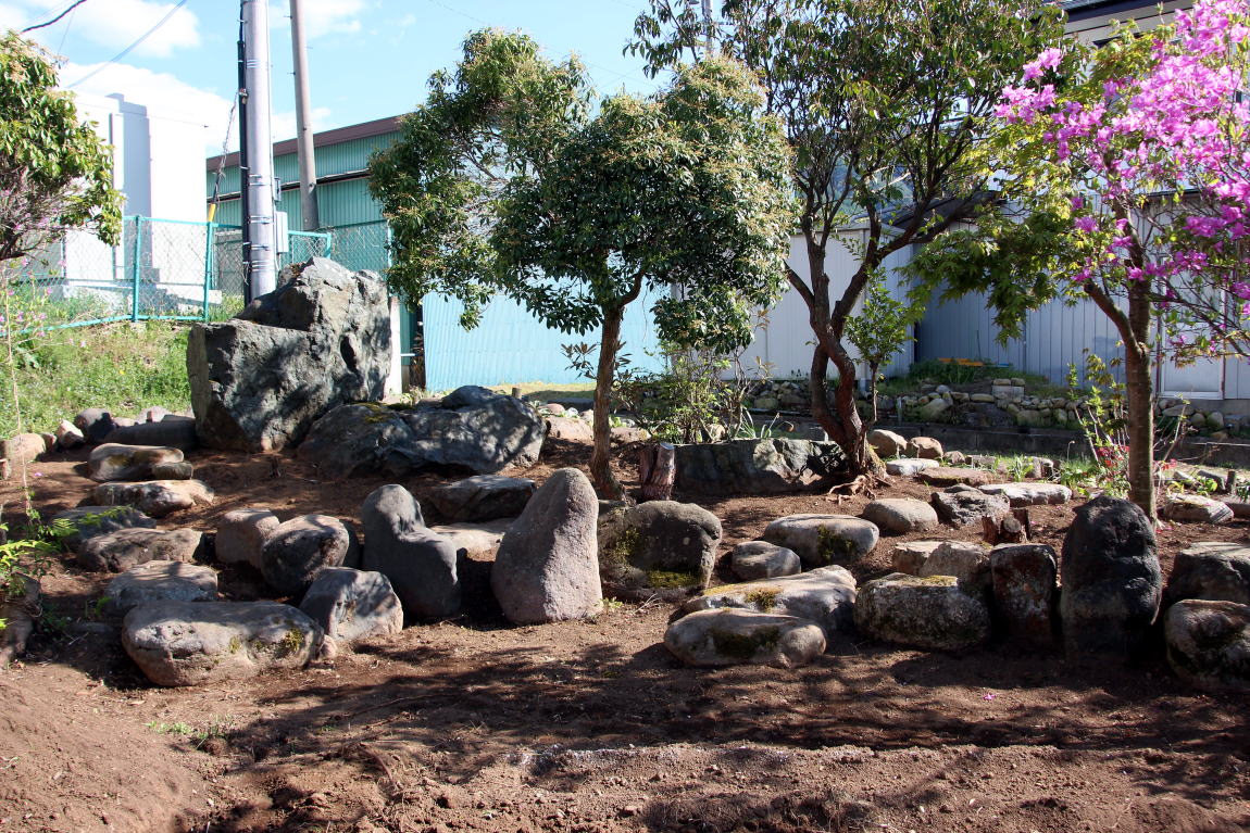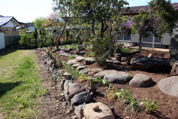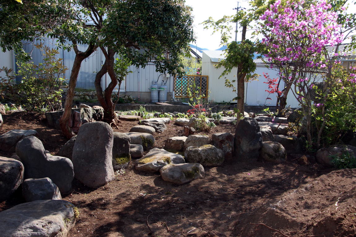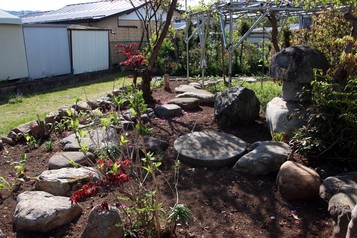 ◆日本の庭園様式・・・「露地・茶庭」昭和31年発行、北尾春通著より一部引用 日本の庭園様式は、上代の原始的なものは別として、およそ仏教の伝来と共に大陸本土の庭園形式の影響を受け、奈良朝から平安朝時代に相当発達したものと考えられるが、その遺構と文献によって作例を今日まで伝え、保存しているものは室町時代以後で、その末期のころには禅と水墨画と茶の湯の精神が庭を支配するようになり、数寄屋に付随する庭が創始されて、当初はこれを「坪ノ内」と呼ばれ、これが桃山時代に至って全く日本的な様式を整えて「路地」または「露地」と称されるようになったのである。現代において一般に日本式庭園と名づけられるものは、その広狭大小に関せず建物の縁側近くに鉢前を構え、袖垣を配し、苔さびた石灯篭を据え、敷砂や蘇苔にかこまれた飛石の苑路を連ね、蹲踞、井筒を添えて石組の巧みさを見せる。 ときには滝あり、細流れあり、石橋を架け池泉には水を漂わせ、水際には役石を置いて汀(なぎさ)を作り、あるいはこれらを枯山水の情景として作り、さらに添景として石宝塔を配し、四阿、庭門を漆え、植栽としては真木を中心に下木、下革を植えなどして、これを築山式、平庭式、池泉式、あるいはその広大なものを廻遊式と称し、比較的狭小な佗びたものを露地式などと称しているのである。これらの庭園は序 その作庭者が茶道の真諦をを極めていると否とにかかわらず皆一様に茶の湯の影響を受けてあらゆる形式や手 法のうちに、茶道の精神である幽玄閑寂の霊を多分に感取することができるのである。こうして桃山時代に発達した霊という様式は茶の湯の普及とともに他の一般庭園にもその影響を及ぼし、現在見るような静けさ寂しさの妙味をもつ庭園と化したことは否めない事実である。 露地の理想とするところは、佗びを主眼とし、周囲の情景を巧みに利用して天然の山水や野趣をそのまま 露地中に描き出し、わずか数歩に足らぬ狭い境域においても、深山幽谷を歩むような感を抱かせ、茶道そのも のにおいて身を茶禅三昧の境地に置き、天地人三才の幽玄美を味得させ、心から清浄幽静な別天地を実現し ようとするものであって、その規模はもとより狭いのであるが、その包蔵する妙趣は広大なる庭園のそれよ りも豊かなものを表現しょうとすることにあるのである。 2020-05-07 ◆2週間かけて庭の手入れを行った 草の根が蔓延っていて腕力がいる草取りに小石に大きい石と地中から取り出したり不要な木の根子を一部抜いた。水仙や行者ニンニク等が草の根子取りに邪魔をしていたので植え替えをした。また多くの石を境に積み上げた。道路から丸見えとなって、ここを通る人達への「オープン庭園」となっている。これも一興かな・・・(^_^)/~~~。だが生木を切った枝や木々の根子・草の根等が三カ所に山積みされている。お金をかけずに これをどうするかである(o-_-o)。自然に朽ちるのを待つのみかな・・・・・・・・・。