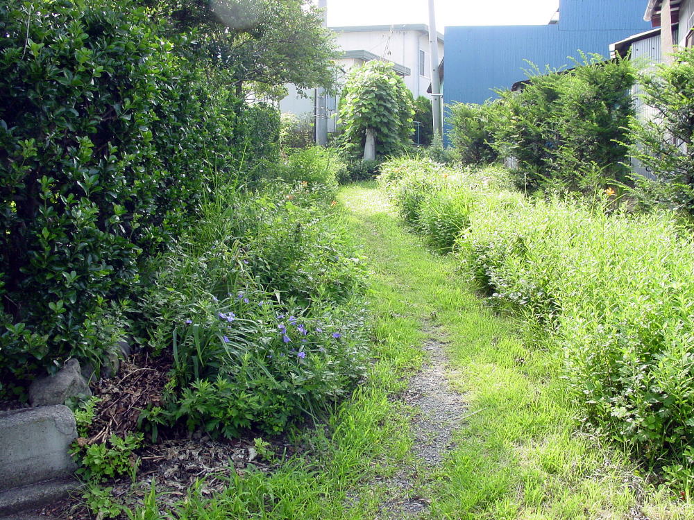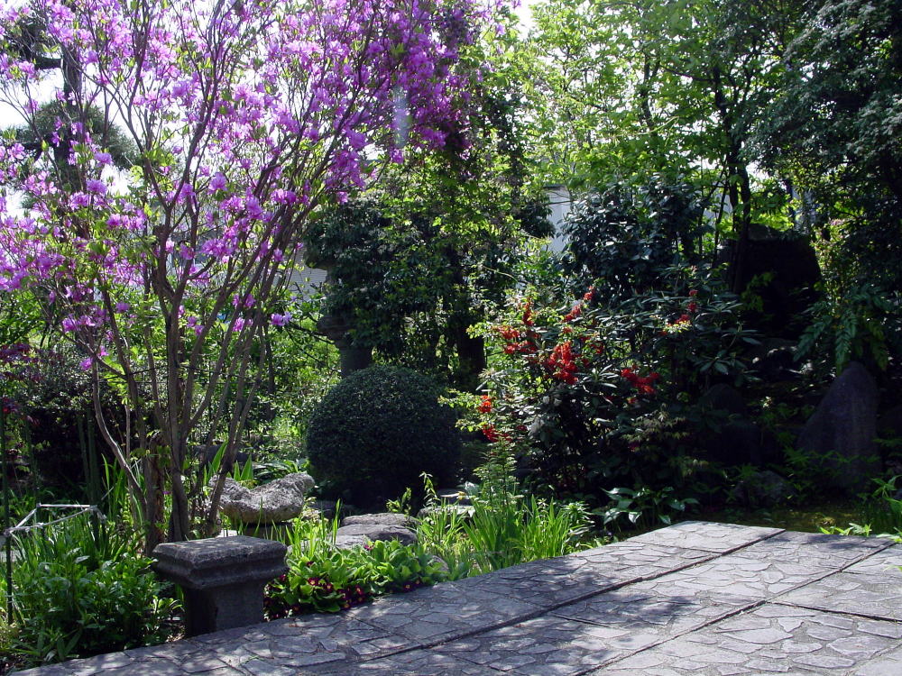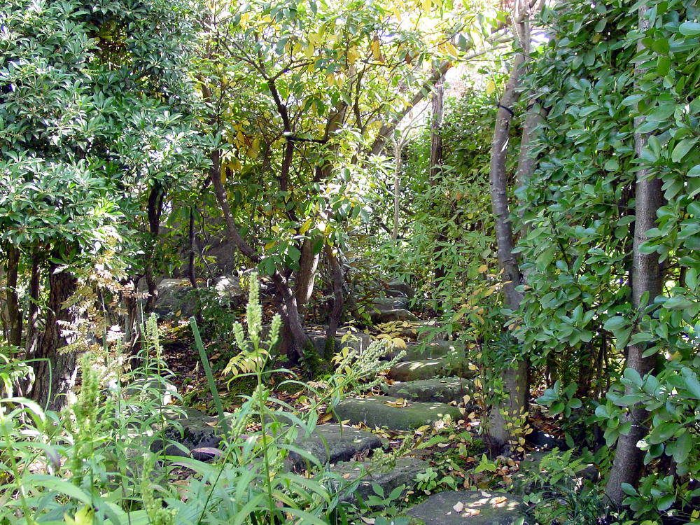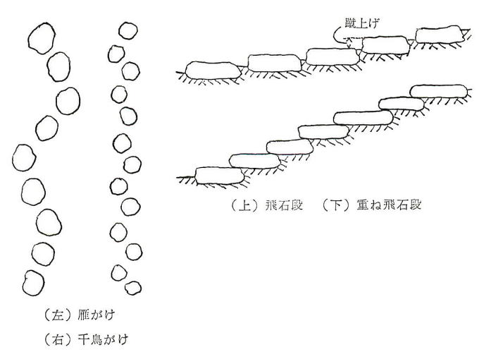 ◆飛石段 飛石というものは本来平地に設けるもの、もし園路が傾斜地につくられるとして、そこに飛石をつけたいと希望する場合には平坦地につくる飛石の形式では適当でない。石の面は平らでなければならず、これを傾斜して据えることはできない。足元がすべるからである。そこで石一個ごとに平らに打ち、それに一段二段と段をつけることになる。これを飛石段という。次々と石の位置が高まってゆく飛石の打ち方である。したがってあまり急勾配の園路には用いられないということになる。要点は階段石として白然石が一個ずつ用いられるということになり、これが切石を用いて石階(せきかい)風になるとこれは庭園の範囲でなく、土木の仕事となる。飛石段というものはそう多くの例はない。きわめてゆるい勾配で、しかも園路が短い場合に行なわれる。庭面のうち池の岸に通ずる道とか、地瘤の上下を連ねる場合とかはこれが適当している。相連なる二石の高さの差は蹴上げと呼んでさしつかえない。この石段も折れ曲がることがある。その折点と踊場が平坦にできてもよいし、ひろければそこに通常の飛石が打たれても決して不自然ではない。 なお石は中心繰上で一個ずつではなく、相並んで二石以上用いてもよいが、飛石段の本来の味は一石ずつを打ってゆくところにある。以上に反し、上下する石が前後両端において少し重なったものがある。これは石の形がむつかしく、また石もやや大きいものに用いられる。この方であると石の厚みにもよるが勾配は前者より少し急な場所にも施工される。これを重ね飛石段と呼ぶ。次に述べるのべだんとも併用できるし、通常の飛石段と交ぜて設ける場合もある。大形の厚い鉄平板を用いる施工などでは極めて自然的な外観である。問題は蹴上げに相当する右の断面の割りロ、野面ものなどに存する。さらに大形の石、殊に長くて厚い板石(例えば仙台石、根府川の原石など)を用いて踏み上がりに据えるとこれまた美しい飛石段となるが、こうなると飛石段の名は用いられず石階または単に石段と称した方がよい。坂石には少しの加工は行なわれるが、大部分は白然状態であり、幅、厚みには不同のところもあるが初めから寸法に合わ せて加工した花庸岩などの切口とは違った味を見せる。