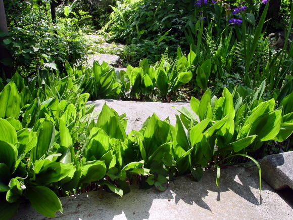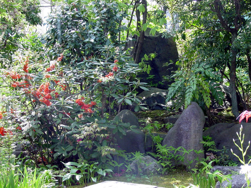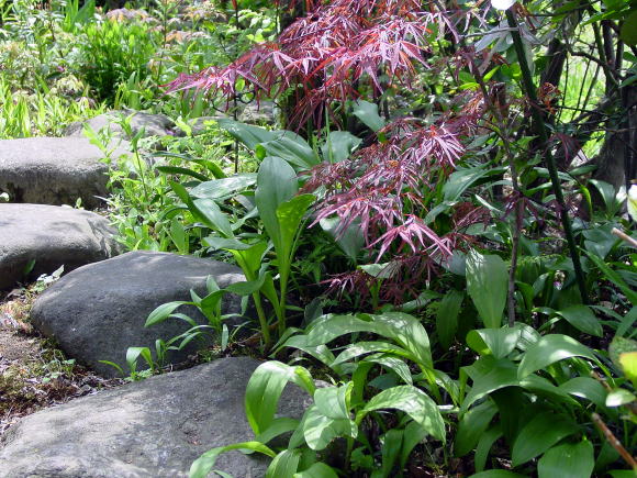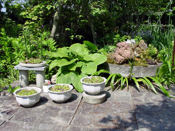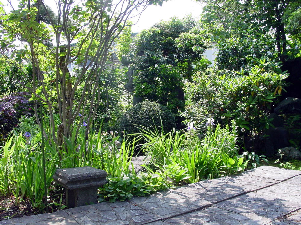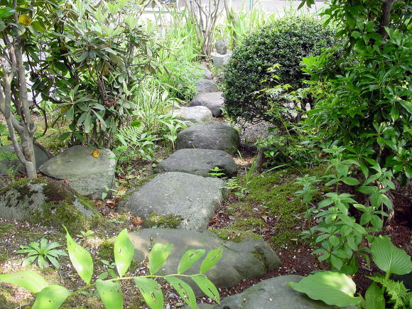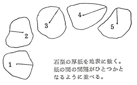 ◆初心者向きの石のくばり方・・・「石組と池泉の技法、昭和42年発行」上原敬三著より一部引用 初心のものが飛石を打つのに簡便な方法があり、かつて一度ならず実施したことがある。もとより専門の庭師が読まれたら一笑ものではあろうが。それは求めて来たり、加工したりした石の形に合わせて、厚紙でその形に実物大に切りぬくのであるが、石の地ぎわの線が外郭となる。そのときよく石を見ると必ず周辺のどこかに特徴がある。例えば少し突出している部分とか、割合に長い直線縁があるとか、その一端、凹みらしいものがあるとか、それを見つけ、その点と石の中心と思われる点とを結んで石型の紙上に一線を引く。この線の意味は紙をはがしたあとで石を置くときの方位をきめるのに役立つ。石は重いので白由に動かないが紙は軽いから思いのままに地表に敷くことができる。どの部分の石からさきに据えるか、あとに述べることを参考として順々に石形紙を並べてゆく。 高さや水平は未定であるが形の方向だけはこれでわかる。相隣る二石の間隔をわたりという。石と石との間に手にニギリコブシをつくり挿入して見る。この事の幅を「ひとつか」と呼び約一〇センチが日本人成人の平均とされる。これだけの間隔が一応標準となる。石の大小により多少の加減はある。この紙の上を静かに歩いて見て、足の運びに無理があるかどうかを検討する。このとき紙の下の地表が掘りかえされていると紙は破れるので地表に鰍を入れる前に紙を敷くのがよい。足運びがわるく、また石の配列が気に入らなければ何度でも紙を敷きかえればよい。紙を敷いて見ただけで歩かなくてもおよそ適否の程度はわかるものである。修正は幾度くりかえしてもよい。それでいよいよ決定となれば紙を除きその位置に番号をつけて照合しておいた有を置く。有の高さ、水平、深さ、いけこみ等は次に述べるような方法で行なうので、ここでは配石までの手順を初心者向きに述べたまでである。