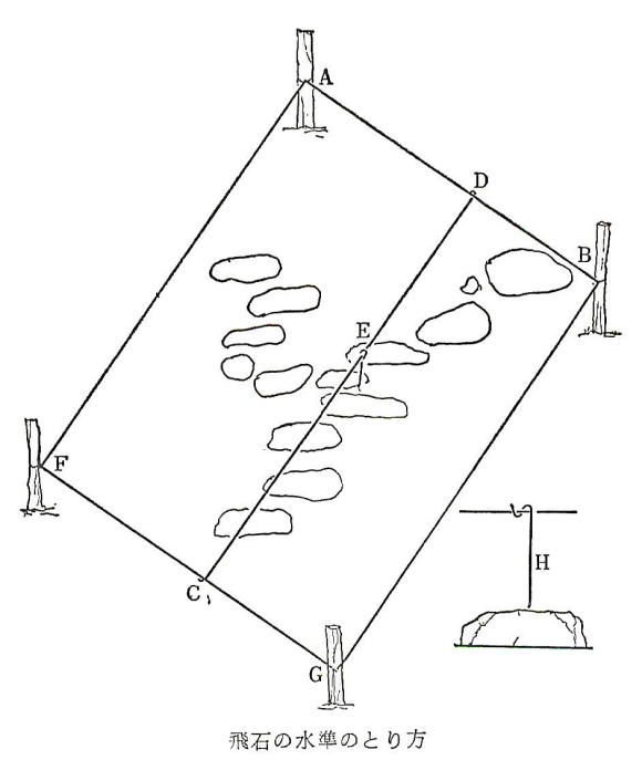 ◆水平のとり方 石を水平に据えるということは大切な注意であるが石の上面は平らであるとはいっても多少凹凸がある。これにレベルをのせて見ると正しさがわかるのであるが見た目にはどうも水平でないということがしばしばある。その場合、器械では水平に狂いがあっても肉眼で見た方の水平に据えるのが無難である。それは石の天端の小凹凸によるからで目の方が公平である。水平に据えるには石の厚みに大小があるので根入れを浅くも深くもする必要がある。石の地上高をチリという。わたりとチリとが巧みに合わないと配石の美しきが現われない。水平にとるには初めに据えた石から順々にレベルをのせてゆき、二石また三石を連ねて一枚の板をのせその上にレベルをのせれば一層精確である。しかしレベルという器具のもち合わせがない場合にはどうしたらばよいか。 その方法を述べる。レベルがあってもこれで行なえる。まず飛石が打たれる区域全株に目をつけ、それを囲んで四方に杭(竹でもよい)を打つ、杭の地上高は三〇センチもあれば充分とする。次図につき説明する。杭A、B、Fを打ちこむ、Aに鉄線(二十番線でよい)を内側でまきつけ、目分量で水平と思う点Bまで張る。次にAと同じ高さと思う位置F杭に針金を張り、ABと平行になるようFG線を張ってそこにG杭を打ってABと平行にG点を巻きつける。次に簡単に水準をきめるためビニール管とバケツを用意し、水を張って管内の水の上下による水準を定める。(これは建築の隙、土台の高さなどを定めるために鳶工がしばしば行なっている方法である) その水準をAに合わせ、次にそれと同じく、B、F、G点を定め針金をその点に巻きなおす。以上でAB、FGは水平に、平行に、同高に張られたことになる。次に飛石の位置に応じFG線中にCを定めその線上に別の針金の一端をゆるく巻く、それを伸ばし飛石の打たれる方向に応じ、AB線上のDにゆるく巻きつけ、CDを水平に強く張る。 CはF、G両点に、DはA、B両点に向かって針金上をずらせることができる。(ABとFGは平行であるので)飛石を据えたとき、その上面がこれらの針金より一定の距離にあれば石の上面は水平となる。そのため針金CD上に短い引きかけられる指針(H)を垂げる。その下端が石の上面にくればその右は水平となる。C、D両点は左右F・G、A・Bに、Eは左右CD両点に白由に動くので飛石の据えられた位置ごとに指針による検定ができる。飛石を起こして土ぎめするとき支障となれば、CD線は一方に片よせられる。飛石の区域ABFGの間ならば杭の打ちかえの必要はない。個々の石は一箇所だけ指針による上面の高さがわかればあとは前述した目分量による石の水平面の判定を行なってもよい。レベルさえあればこのような面倒を行なう必要はないのだが、地方の田舎で庭つくりのときこの器具がない場合の応急策である。