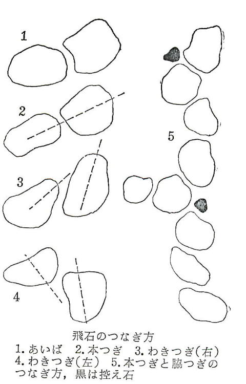 ◆石の配り方 飛石を打つときは打ち始めから一石ずつ順々に敷いてゆくのはよくない。中心線を大づかみに定め、殊にまがりの点が大切であるが所々に急所を定め、形のよく、力のある石を飛び飛びに要所をおさえるようにして配ってゆく。踏みどまり、踏み分けなどはその急所の最も大切なものの一つである。そして据えられた石から前後に順々に据えてゆき、既設のものとすり合わせるようにする。中心線は初めに定めたものを正確に守ることは無理となる。それでよいので、石の幅、わたりなどに過不足がでれば控え石で埋めてゆくこともできる。ただし控え石が多すぎるのは見にくいものであるからやむを得ない継ぎ目にだけ使うといぅことを心がけたい。多い少ないといっても標準はないが、位置は右側、左側に片よらないこと、大きさに変化をつけること、これらは現場による。日本人の歩幅はだいたい平均して四八センチ、石の間のわたりが一〇センチとすると一足ものを並べてゆけば石の径は三八センチとなり、二足ものでは八六センチとなる。これは一つの標準である。 中心線の上を歩くのが本格な歩き方であり、社交ダンスの場合などこの歩き方を目標としている。しかし多くの人は右左の足が中心線の右左に出るが、左右の足の中心間隔はまず最大一五センチとされるので石の幅はそうむつかしく考える必要はない。前後に接する石のつなぎ方の名称を示すと上図のようである。石の中心線で結ばれているのが「本つぎ」、二石の中心線の方向にずれがあるのが「わきつぎ」それに右、左の二種がある。二石の側面が凹凸または平行直線で接するのが「あいば」である。飛石の岐れ目の第一石は本線二石の中間に置かず必ず本つぎまたは「わきつぎ」の方法で接続するようにする。「控え石」はつぎ目の中間にあってもさしつかえない。なお一般とはいえないが普通飛石を打ったのち・その間、左右にゴロタを敷く方法がある。これであるとゴロタのなかに飛石が打たれているように見え、ゴロタ敷きが主か、飛石が主か、見た目に迷うことがある。州浜飛石にあっては当然ゴロタ敷きが主であることはわかるが、通常園路であると主副が判明しない。細砂を敷く場合には飛石という道なりに敷かず、少しひろく敷くのも一法である。