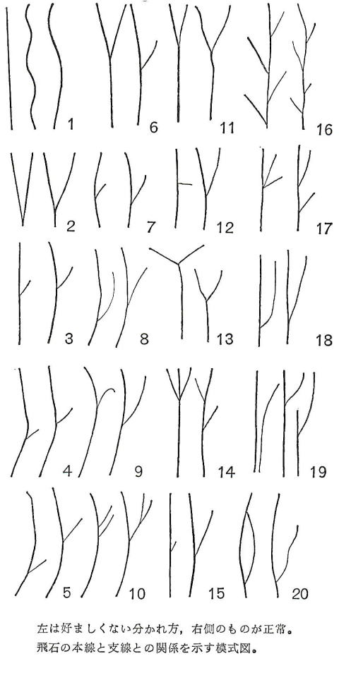 ◆ 飛石の中心線 個々の飛石の中心を結んで見ると一つの線ができる。これを飛石の中心線という。これらには曲直や分岐がある。そこで本線(主線)と支線(副線)という軽重を生じ、飛石の向かう方向によっていくつかの注意すべき点も現われてくる。飛石は直線で進むのか、曲線とした方がよいのか。甲乙二点間を結ぶとしたら、直線の方が簡単である。しかし配石の美しきという点になると多少の曲がりがあった方が特徴が出てくる。京都の史的名園を見ても、曲直の両者があり、扁するということはない。建物近くではかなり曲がっていて美しい配石を見せるが、庭のなかで相当長い囲路の飛石にはほとんど真直なものもあり、その場合、石は小形で間のわたりもひろく、しかもその石の形は充分考えて選ばれたとは思われないものも多く、歴史的のものであるから美醜を問う必要はないものの現代人の感覚からいうと美しきという点ではどうかと首をかしげるものもある。軒内近いところでは相当注意して打ったのであろうが、園内に入ってはむしろ実用本位で石を使ったのではないかと考えられる。中国の庭では真直のものは飽くまで真直に、曲がるものは極端に曲げられているといった傾向がある。何れがよいとか、わるいというわけではなく、そういう事実があると率直に例を示しただけ、一切は現場に即し、設計家の意図にしたがって打ってゆげはよいものと思う。本線、支線となると少し違う。殊に飛石をカーブをとるように曲げる場合、横石を使うとか、竪石の方がよいとか古書に示されているが、石の配り方を美しく見せようとするには本線の曲直と、支線として分岐してゆくその在り方、殊に分岐点の注意については多少の説明を必要とする。以下それらを図について述べておく。(題と図との数字は一致する、二図のうち右側の図は好ましい形) 1 あまりに直線が長く続くのは変化がなくて好ましくない。また曲がり方が終始同じようなのも見栄えがしない。曲がり 方に少し変化をもたせる。短距離で曲げるのをヒズミといってきらう。 2 打ち始めの石からすぐに分かれるのはよくない。少なくとも打ち始めにつづく第二石以後の石で分岐したい。直線で ある本線上の一点から分岐する場合、その分岐点に少し曲がり目をつける方が美しく見せる。 4 直線(本線)から支線を出すときは折点から岐れたい。折点の少し手前などで岐れると力が弱い。 5 曲線の場合でも前項と同じ、4、5とも曲線としないときは石の大きさを変えただけでもこの気分は出せる。 6 本線か支線か不分明な岐れ方はよくない。この区別は曲がり方、長さ、石の大小、用い方によってそうむつかしい区 別ではない。 7 本線(曲直ともに)の内曲の側から支線が出るのは見ぐるしい。その部分の本線を外曲とするよう、前後から本線に加減をして進めたい。 8 分岐点はよいとしても、支線の方向が本線を切る(切らなくても切るような感じを与える出方も)ような出方はよくない 。すべて線は向かうべき方向、勢いというものに細心でありたい。 9 支線の方向があともどり気味に感じさせるのは (実際にはあともどりするはずはないのだが)飛石の混乱を示す。 10 本線の曲直にかかわらず、比較的接近した距離で連続して同一方向に二本の支線が出るのはよくない。殊にそれ らが同じ方向に向かってほなおさらよくない。かならず支線一本とし、それをさらに分ければよい。内曲部であれば 7で述べたように一層わるいものである。 11 分岐角はいちじるしい鋭角であってはならない。かならず鈍角にとる。 12 本線の曲直にかかわらず、直角に支線を出すことは好ましくない。鈍角でありたい。 13 鈍角を希望するといっても本線を折点で曲げすぎて三つの角を同一になるような分岐はよくない。その三つの角度 を少しずつ違えるように鈍角にとる。 14 本線上の一点から十字形または掛の穂状に分かれるのはよくない。左右に分けたいときは少し間隔をおくようにす る。槍の穂の形の場合、左右の角が同一になるのは当然好ましくない。 15 長い本線が曲直いずれにしても連続して走っている場合、その一点からきわめて短い支線を分けるのは力が弱い し、支線らしく見えない。本線の長さに応ずるよう支線を考えるべきである。 18 支線が本線から分かれる状態はよいとしても(a)同角であること、(b)支線が平行すること、(C)分岐点相互の距離 が同一であること、(d)支線が多すぎること、この四つは避けたい手法である。飛石が平凡と乱雑に見える。 17 本線上の二軍から片側に二本の支線を同一分岐点から出すことは面白くない。かならず段をつける。 18 支線が本線と平行に走ることは無意味とされ、これを避ける。 19 打ち初めから二本の中心線が平行で発し或る点で曲がるのも重視の感じとなり好まない。 20 本線と支線が両端で結ばれている形は支線とはいえない、避けるべきである。 なお古書には飛石のまがっているものに二つの名称を与えている千鳥