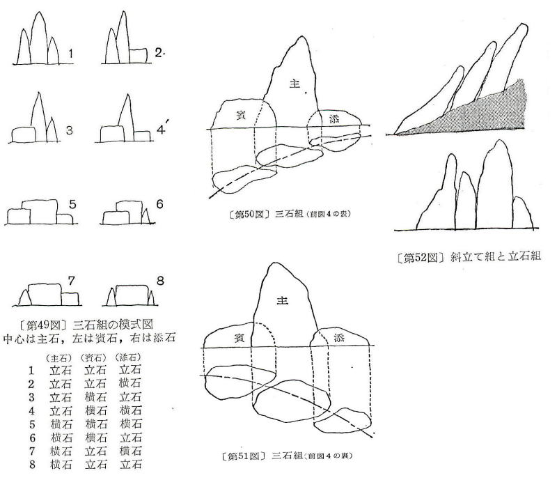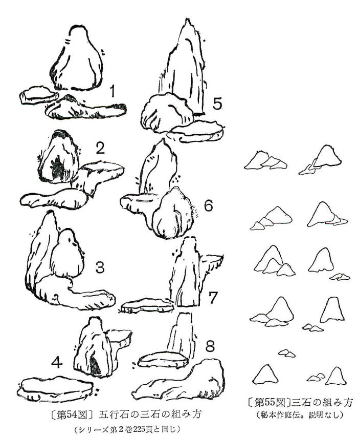 次に前述の五種のなかから4の場合を選んでその実態を図示して見る。一つは4の表(賓石(ひんせき)が前)・他は4の裏(賓石が後)の図である。この図は正面と平面とを示している。側面は石の厚みに関係あり、こうした図は4以外の四種についても各々つくることができる。平面図に見るところの斜線が石組の勢いを示す線である・石の置き方次第でこの勢い綿は外曲にも内曲にもなる。この図を見てもわかるとおり三石の間には各石の高さ(地上高の意)見付き幅、奥行、板張り・表面の組織が一個ずつの石としては大切であり・関係的には隣接の石との距離、方位が重視される。この際主石と賓石との石質をかえて変化、対象の美しさをねらうべきだという説もあるが一組の石組をまとまったものとして考える立場から著者はこの説には賛成しかねる。もっとも人の好みとあればやむを得ない。 この三石が単位となり・これから五石、七石の組み合わせでもできるし・さらに多くの石の組み万も生まれてくるが・それは次に述べる。有機的に結合しないでただ三石を無意味に近かよせて据えることもあるが、そうした例を挙げれば際限がないし・そうしたものは三石には違いないが、ここでは単位として考えた三石組のなかに含ませない。ここに図示したような三石の斜立てもの、立石組は練達の人にして初めて成功するもの、初心の人にはむつかしい。三石の組み方にあって最も大切な着目点は個々の石は組み合わせに当たってどういう点に注意するか、組み合わきったl群は庭の全体に対してどういう立場にあるべきかという庭全体の設計について考慮を払うべき要点である。そのうちまず後者の場合をさきに述べる。三石の配列は五石以上の場合より簡単なのでまずここで充分認識をふかめ・次に五石以上に及ぼしたい。 それらについては材料として樹木をえらんで同様な着眼点をすでに述べておいたのでそれは多分に石組にも応用される、樹木の取り扱いに関し庭石にまで及んで記述されてある。異なるところは樹木と庭石との形態・性質上の差異から来ている。したがって・改めて事あたらしく再び記述するの煩を避けたく・右の書物を熟読されることをすすめたい。要するに調和、釣合、比較(対立)、配分、強調、省略といったことに帰する。なお樹木と庭石とは相撲して用いられ表現上これら相互の間に切りはなせない関係をもっている。よく石組で不完全なところは植物材料をもって補うとか、欠点をかくすとか・強調するとかいわれる。これは誤った考え方ではないが、いつも植栽材料に頼っているという安易な心境は石組に習熟する上に邪道となる。 植物がなくても石組だけで独立して美しいものに仕上げる心がけが大切であり、植物が加われば一層よくなる、植物の表現でな組ければ達成させられない特徴があるといったことは第二次に考えた拾いものであるということに気付かれたい。ここでは主として石組を論じているので植物が加わることに関係のない構成を述べておく。植物には生長ということがあり、これは年々大観を変えてゆく、庭石にはそれがない、したがって庭石だけで充分見るに足る組み方を行ない、それに植物が伴っているとしたら永い年月ののちには植物の生育、外観の展開によって石組が圧倒されるきらいがある。これが当初の石組景よりも年を経た石組を美しく見せる手段にもなるが、反面に苦心した石組力作を見劣りさせる理由にもなる。歴史的名園の石組を批判する上にこのことは重要な分岐点となる。 古庭園の鑑賞には植物を無いものとし、石組だけについて考察する、有るものを無いとすることは無理であるから心眼で植物を無視するのである。第二に石組と庭の地表および水 (水がない場合には必要なく) との連絡、相関性を思い及ぼす、石組というものはそのものだけで独立しているわけではなく、客景として水があり、時には耕作物さえも伴っている、庭全体から見てどういう位置にあってよいものか、これは石亀の区域を超越して定める場合もあろうかと考える。すべてそうした点に満点を与えるような配置が石庭の美しさなのである。次に話は前にもどるが三石の場合、その各々の石はどういうものが選ばれるのであろうか。まず、主石であるがこれは形はどうあろうとも群の石のなかにあって王者の貫禄を示すものでありたい。 大きさ、形がそれに伴うのはいうまでもないが、単にそうしたこと以外その石の備えている気魄というか、勢いというか、そうした内容が主位に坐して他の上坐に値するものでありたい。むつかしい言い方だが、実際に石を見れば選択はそうむつかしいことではない。賓石は主石に対して補いというより、それに添って主石の美しきを強調する内容をもっていることが重要である、主とか賓とかいうのは相対的な名称である。添石はそれらにくらべればはるかに貫禄の低いものでよいが、添えられて美しきを増すような形であるものが添石の特徴と