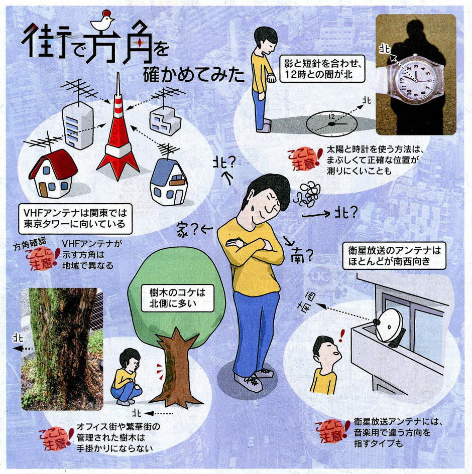 2016-04-23・・・日経より引用 ●道に迷った…何を頼り 不慣れな場所へ、 ハイキング・散歩・ジョギングウオーキングに行ったときに迷子になったら よく道に迷う。スマートフォン(スマホ)のナビを見ながら歩いても、どの方角に向かっているのか、すぐに見失う。地下鉄の出口でも左右どちらに進めばいいのか分からない。せめて方角が分かれば手掛かりになる。住宅街やオフィス街、繁華街で、方角を知る方法を探った。方角といえば太陽。時計を使って確かめる方法を、子どもの頃に習ったことがある。アナログ時計を用意し、短針を太陽の位置に合わせる。短針と12時の真ん中が南になる、というやり方だ。ただ実際にやってみると、まぶしくて正確な位置を測りにくい。 ・・・・・影と短針を合わせ12時との中間が北・・・・・ 「迷い迷って渋谷駅」などの著書がある街歩きの達人、昭和女子大学の田村圭介准教授に聞くと「影を使えばいい」と教えてくれた。短針を太陽ではなく、自分の影の方向に合わせるのだ。12時と短針の中間が北になる。地域によっては微妙にずれが生じてしまうが、それでも時計の針で12時と1時の間に収まる程度。方角を知るには十分だ。ただしこの方法は、雨天だと通用しない。昼夜天候を問わず確認する方法はないか。日本地図センター(東京・目黒)の主幹研究員、小林政能さんに尋ねると、「街中で方角を知るには、家の向きやベランダの位置、衛星放送のアンテナが手掛かりになる」という。 庭やベランダは南側が多い。衛星放送のアンテナはおおむね南西を向く。樹木の茂り方から方角が分かることもあるようだ。助言を胸に、さっそく街を歩いてみた。まずは自宅周辺から。方角を確認するコンパスはスマホのアプリを利用した。マンションのベランダや一戸建ての庭は、確かに南向きが多かった。ただ必ずしも真南ではないので大まかな目安といった程度。太陽光パネルも南向きだが、正確な方角までは分からない。庭や公園の草木は南側に向けて生い茂っているようにも見えるが、確信は持てない。小林さんによると「樹木の茂り方は山に行けばある程度手掛かりになるが、街中ではあまり役に立たない」。地形や植え方に影響されるようだ。街路樹についたコケは、北側の方が明らかに多かった。 これは使えるかもしれない。衛星放送のアンテナは、そこら中にあった。どれも同じ向きだ。家庭で使う衛星アンテナの大半は東経110~128度の赤道上を向いており、方角だと南西になる。アンテナなら雨天でも確認できる。知っておくと便利だ。渋谷や新宿といった繁華街でも調べてみた。住宅街と違って、ベランダや庭などの手掛かりはない。ブラインドが閉まっている方が南側ではないかと考えたが、必ずしもそうではなかった。目隠しのためにブラインドを閉めるオフィスが多いようだ。衛星放送のアンテナはたくさんあった。住宅街では1つしかない家が多かったのに、繁華街では複数ある。しかも明らかに角度が違うものがある。どういうことなのか。 VHFアンテナ東京タワー向き アンテナのプロ、東京アンテナ工事(東京・葛飾)社長の三夫宏さんに聞くと「東経154度にある衛星を利用するアンテナがある」と教えてくれた。デジタルラジオ放送などが使っているという。た だしBS用などと比べてアンテナの数は少ないので、周りを見渡せば見分けられる。こちらは南西ではなく南南東を向いているので、間違えないよう注意したい。三夫さんはさらに、アンテナを使った方角の確認法を伝授してくれた。注目するのはVHFアンテナ。魚の骨のようなUHFアンテナよりも大きく、横の骨の長さが均一ではないアンテナだ。地上デジタル放送への切り替えで不要 になったものの、多くの家やマンション、雑居ビルなどの屋上にまだ残っている。「横の骨が短い方が電波を受ける側で、関東地方の場合、東京タワーを向いている」という。東京タワーの方角は場所によって異なるが、近い場所なら手掛かりにはなる。「VHFアンテナは名古屋なら名古屋テレビ塔、大阪なら大阪府と奈良県の府県境にある生駒山など、各地域の旧送信所を向いている」といい、調べておくと使えそうだ。方角確認法、オフィス街ではどうだろう。大手町で調べてみた。影と時計はもちろん有効だった。 問題はそれ以外。衛星放送のアンテナは、高層ビルが立ち並ぶオフィス街では見つけられない。もちろんVHFアンテナもない。ブラインドも手掛かりとしては弱い。街路樹や植栽はどうかと言えば、きれいに刈り込まれるなど管理が行き届き、全く参考にならなかった。日本地図センターの小林さんは「高層ビル街は全地球測位システム(GPS)でさえ位置を間違えることがある。地球上で一番方角が分かりにくい場所ではないか」と指摘する。晴れの日の昼間は影と時計で確認し、それ以外はビル名などをチェックする。どうやらそれしかないようだ。 ビル街、照り返しに注意 取材の過程で知ったのが、方位磁針が
