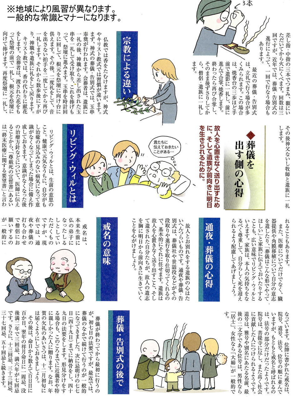 ☆ある問題、ある疑惑、ある出来事などを質問される・状況を聞かれる こんな時に、焦って答えを探す・モジモジしている・「・・・・・・・」と無言でいる。が利口ぶって、見下すように、さらりと曖昧な受け流しの偽りの答えではいけない。そんな言葉で答えられる場がしらけてしまう。分からない知らない答えられなかったら素直に「わかりません」と答えるの鮮明だと感じる。だが皮肉った質問などには「・・・・・」で良いと感じる。 知っているのに答えないといこともある。これが一番やっかいなのである。答えたくない・教えたくない・聞かしたくない、と「・・・・」の場合は相手側は更に疑惑の眼で何時までも忘れないで問い詰めようとするだろう。また身内のことを聞かれて答えない態度は更に悪い印象を与えてしまう。相手が居なくなってからその人の悪口を言う樣ならば、馬鹿と言われても当たり前であろう。 「わからない」「答えられません」と素直に認めてしまうと、自分自身だけでなく、周りの人もとても穏やかな気持ちになれる。 2007-**-**・・・イエローマスタードより引用 ●知っておきたい弔事の常識とマナー