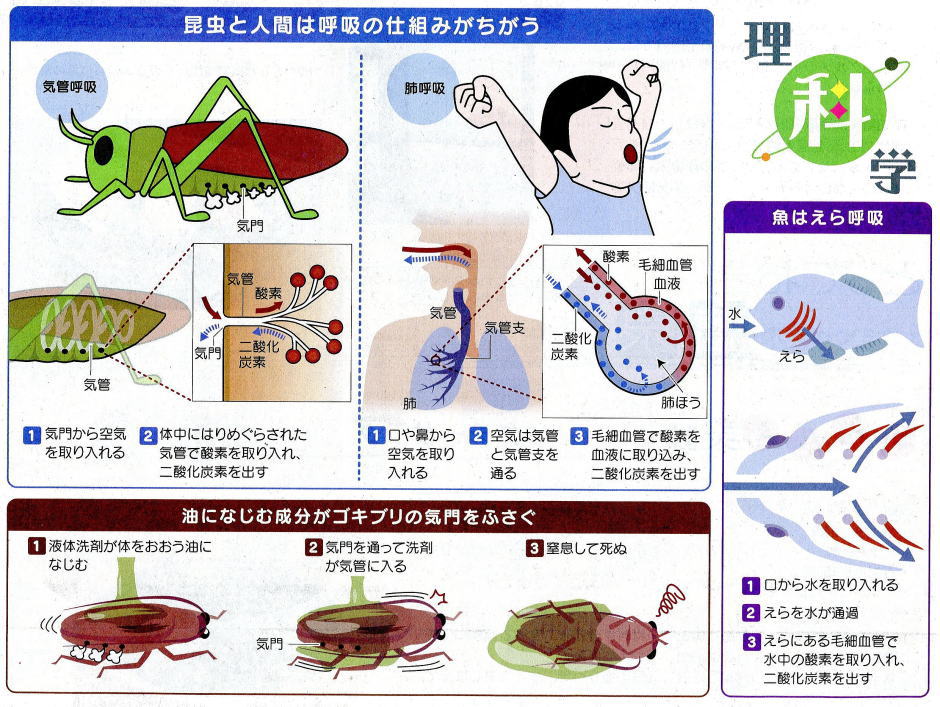 2016-09-03・・・日経より引用 ●ゴキブリ退治なぜ液体洗剤が効くの? 体の空気穴がふさがって窒息するんだ 夜に喉が乾いたから、台所で水を飲もうとしたら、大きなゴキブリが出現。思わず側にあった液体洗剤をかけたら、暫くジタバタして死んでしまった。ゴキブリに液体洗剤をかけると、最初はあばれるけど、すぐに動かなくなってしまう。洗剤の中に何か悪い成分が入っているように思ってしまうけど、それはまちがいだ。実は呼吸ができなくなって窒息して死んでいるんだ。生物は生きていくために呼吸して、空気中の酸素を取りこみ、体の中にたまった二酸化炭素をはき出している。昆虫のゴキブリは人間やイヌなどのほ乳類や鳥類、は虫類とは呼吸の仕組みがちがう。 人間は口や鼻から空気をすいこみ、気管や気管支を通って肺のおくにある「肺はう」と呼ぶ小さなふくろに届けられる。肺ほうでは、毛細血管で血液に酸素を取りこみ、不要な二酸化炭素を出す。これに対し、昆虫は「気門」という小さな穴から空気を取り入れている。バッタやセミ、チョウをつかまえて体の横をよく観察してみよう。小さな穴がついているのに気づくと思うよ。これが気門だ。気門はふつう昆虫の胸の部分の両側に2対、おなかの部分に8対ついている。気門は20あるわけだ。 昆虫で肺にあたるのが「気管」だ。気門からつながっている細い管で、昆虫の体じゅうにトンネルのようにはりめぐらされている。気門からすいこんだ空気中の酸素を体内に取り入れて二酸化炭素を出す。気門が水にぬれてふさがると、呼吸ができなくなって死んでしまう。このため、多くの昆虫の体には気門のまわりに細かい毛がはえていて、水をほじいて気管に入らないようにしている。ゴキブリの場合は体の表面に油がついている。だから、ゴキブリは「アブラムシ」と呼ぶ地域もあるくらい油で光ってギラギラしている。水をかけてもはじくから、ゴキブリは平気でいられる。洗剤はなぜ気門の中に入りこめるのかな。 これは洗剤にふくまれる界面活性剤という物質がかかわっている。例えば、洗剤でお皿を洗うと、油よごれがきれい落ちるよね。これは界面活性剤に水と油がくっつくようにする働きがあるからなんだ。ふつうは水と油を混ぜても、しばらくすると2つの層に分かれてしまうけど、洗剤を入れてかきまわすと白くにごった液体になる。水と油が混ざったからだよ。ゴキブリの気門から入った洗剤は気管の中まで広がってしまい、空気が取りこめなくなる。ゴキブリは気門がいくつかふさがっても、他の気門から空気を取り入れて呼吸ができる。 でも、洗剤が体全体にかかると、気門がすべてふさがってしまうから、ゴキブリは窒息してしまうんだ。洗剤でなくても油となじみやすい液体をかければ、ゴキブリは気門がふさがってしまい、呼吸ができなくて死ぬ。サラダ油やオリーブ油といった食用油、化粧品の乳液をかけても同じ結果になるよ。ゴキブリが死ぬのは不思議に思えるけど、ちゃんとした理由があるんだ。取材協力=長島孝行・東京農業大学教授、・原田哲夫・高知大学教授