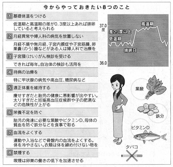 *都合よい形、押し付けないで 女性活躍と聞き「自分も活躍したい」と思う人より「都合良く女性を持ち出され、不快」という人が多い--。調査からはこんな状況が分かる。専門性を生かした短時間勤務を望む主婦は多いが「子どもの長期休みや病気に対応できない」との声が目立つ。「育児を平等に分担したいが、夫の協力は1%くらい」(40代)という人もいた。労働政策研究・研修機構の「子育て世帯の追跡調査(第1回・2013年)」では、妻の就業時間が週平均10時間増えた場合でも夫の家事時間の増加は平日で2・9分。これではカップラーメンも作れない。「女性活躍推進をするなら、保育士や介護士の給料を上げ、憧れの職業にしないと」 (30代)、「女性も絶対に働かなければという風潮があるが、専業主婦という選択肢も残してほしい。今の世の中は女性の負担が増えただけ」 (30代)という意見は根強い。「活躍」は国のためでなく、自分と家族のため。活躍の形は自分で決める。そんな主婦の本音が垣間見えた。 *5時から女・5時まで女 仕事を定時で終えて、飲み会や習い事で私生活を充実させるのが「5時から女」。5時になったとたんに地味な姿から派手なメークでバブル期のお立ち台さながら躍りまくる女性を、日本エレキテル連合がコントにする。ただ実態は、残業をしないようにと職場を追い出されるから「5時まで女」。膨大な仕事量を割り振られ、昼ご飯も食べられないという忙しい女性社員が増えている。働き方改革で5時まで女が5時から女に変われる日はいっ来るだろうか。 *匿名ブログ「保育園落ちた」 匿名ブログに書かれた「保育園落ちた日本死ね」が反響を呼んでいる。この文章は公式なものでなく、保育所不足に対しひたすら個人的な怒りを綴ったもの。だがそれゆえ多くの人たちの感情に訴えた。2月29日には山尾志桜里民主党議員から安倍総理に本件に関し質問があり、総理は書き手が匿名であるため、「実際に本当におこっているのか、我々は確認のしょうがない」、もちろん待機児童がいると認識しており、政府は保育所を増設していると答えた。 安倍総理の回答は、次の2点の問題が指摘できる。第一は、保育所不足を訴える声は政府の対応不足の証左だが、それに対し「いや対応している」と言い切るのは、結果的に国民の切実なニーズを事実上圧殺する意思を示してしまっている点だ。きっかけは匿名ブログでも、待機児童問題が深刻なのは各種統計調査に鑑みれば明らか。たとえば都内では2016年度で6区の入所倍率が2倍を超える。15年4月時点の待機児童数は約2万3千人だが、厚生労働省の調査では潜在的待機児童数は85万人に上る。この数値の背景には、多く の保護者、とりわけ女性たちが就業継続を断念するなどの選択を余儀なくされているという事実がある。安倍総理は国民の生活実態に即して正しく認識しているのだろうか。第二は、ブログに書かれた「子供を産んで子育てして社会に出て働いて税金納めてやるって言ってるのに日本は何が不満なんだ?」が端的に示す。今この国で子どもを産み育て働こうという女性は、まさに安倍総理が掲げる「一億総活躍社会」の中軸を担う存在であるはずだ。 「アベノミクス新・三本の矢」が目指す国内総生産(GDP)向上や人口規模維持のためには、待機児童問題の解消は焦眉の急のはずである。シカゴ大学の山口一男教授によれば、経済協力開発機構(OECD)諸国では1990年代以降女性の労働参加率が高まるほど出生率も高くなる。日本でも育休を取得できる女性は専業主婦と同程度かそれ以上に出生率が高い。育児に関する制度や施設の不足解消は、安倍政権の政策目標達成のためにも必須のはずだが、当人がその必要に対する認識が甘いとは、極めて残念な話である。詩人・社会学着水無田気流 2016-04-16・・・日経より引用 ●妊娠に備え、20代からできること 月経時の異常、早く気づいて 糖尿病や脳の病気、痩せすぎにも注意 今は未婚で仕事も忙しいが、将来はぜひ子供を産みたいと考えている女性は多いだろう。ただし、妊娠出産にはタイムリミットがある。「いつかそのうち」にと思っているとチャンスを逃すことも。妊娠出産に備え、今からすべきことは何か。独身時代からできる妊娠のための準備「妊活」について専門家に聞いた。 女性の平均初婚年齢は29・4歳、同初産年齢は30.6歳と晩産化が進む。ただ、現実は加齢に伴い妊娠・出産は難しくなる。特に30代後半からは顕著だ。体外受精など高度生殖医療を受けても、妊娠・出産率は30代半ばから年々低下、逆に流産率は急上昇する。「医学的には20代が最も妊娠しやすく、母体、胎児とも安全に出産できる確率が高い」と東邦大学医療センター大森病院産婦人科の片桐由起子教授。 不妊治療を受ければ妊娠すると思っている人が多いが「残念ながら万能ではない」(片桐教授)。体外受精などで出産に至るのは、20代でも総治療件数当たり約2割だ。将来、妊娠を望むなら、独身であっても20代から定期