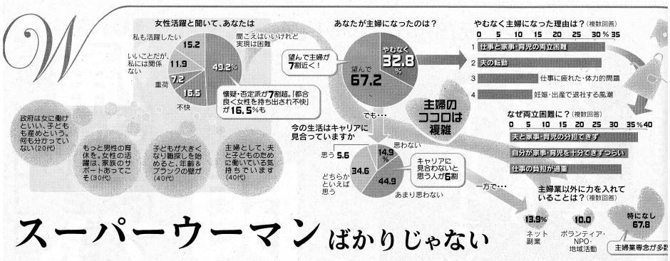 16-03-19・・・日経より引用 ●スーパーウーマンばかりじゃない 活躍したいが「家を犠牲」イヤ 「夫の転勤」が意外な伏兵 「すでにお金のある企業をより裕福にするのとは、違うことをしてみたかった」NPO法人ルーム・トウ・リード・ジャパン (東京・港)は途上国の教育支援が主な活動だ。ボランティアで共同理事長を務めるコールドウエル中島恵さんは、3人の子どもを持つ主婦だ。「次の世代につながることをしたい」との思いは子育てにもNPO活動にも共通している。同NPOは一晩で1億円もの寄付を集めるパーティーを開く。中島さんは米国の大学を卒業後、広告会社などでマーケティングの仕事をしていた経験をNPO運営で生かす。 「スキルを持ち寄り、楽しみながら社会貢献できる」と笑顔を見せる。日本経済新聞社が大卒以上の学歴を持つ20代から亜代の主婦千人(専業主婦と、夫の扶養の範囲内の人)を調査したところ、ボランティアや地域活動に力を入れている人は全体の1割ほどだった。6割が「今の生活は自分の学歴やキャリアに見合っていない」と感じている。一方で中島さんのような一歩を踏み出すのはなかなか難しいようだ。 やむを得ず主婦になったと回答した人で最も多い理由は、家事・育児と仕事の両立が難しいこと。ところが意外にもはぼ同数の31%と目立ったのが「夫の転勤」だった。「特許事務の仕事をしていたが夫の赴任で地方に住んだら、事務所自体がほとんどない」 (40代)。都市部を離れることで再就職がより難しくなる例は多い。家事・育児と仕事の両立が難しかったという人に理由を聞いたところ、最多は夫の協力不足で37%。次いで34%の人が挙げたのが「家事・育児を十分担えないことがつらかった」という自責の念で、仕事の負担を訴える声より多かった。 「子どもを犠牲にするか、自分が倒れるまで頑張るかの二択しかない」 (30代)。「スキルがあるために責任ある仕事をする立場になってしまい、結果家事育児に支障をきたす」 (40代)。有能ゆえに仕事への責任感を抱え込み、だからこそそこまで打ち込む仕事生活を選べない。あれも、これも、私がやらなきゃ。女性活躍社会の実現とはチャンスだけでなく、「スーパーウーマンになれ」との責務と感じる人が少なくないようだ。(桂皇子)