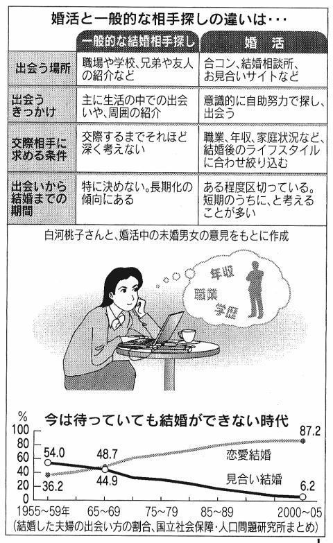 2008-11-18・・・日経より引用 ●婚活、出会い求め見合い・合コン行脚 結婚難の現実 周囲も理解 「現在、婚活中」。最近、こんな言葉を使う三十、四十代が目立つ。結婚相談所や合コンなどをフル活用。「就括(就職活動)」のように結婚活動をするということらしい。だが、青葉の軽い印象と裏腹に、出会いを求める人たちの実情は想像以上に切実。ロにできない苦しさを「婚活」という言葉が和らげ、癒やしている面もあるようだ。 「どうして私は選ばれないの」。垂泉の有名商社の一般職、A子さん(32)はため息をつく。もともとは二十代前半に結婚したいと思っていた。ところが友人が次々結婚していくのに、自分は彼氏さえできない。三十一歳で思い切って結婚相談所に入会した。交際相手の条件は有名企業勤務。合コンは百回以上、見合いも十数人に申し込んだ。だが、会えたのは一人。やめたいと思うこともある。「でも、何もしないと一生独身かと不安を感じ、また婚活にのめりこむ。依存症かも」と苦笑する。 「自分がこんなに不人気とは」。執筆業のB男さん(43)は、軽い気持ちでインターネットの結婚情報サービスに登録したところ、現実の厳しさに驚いた。「四十三歳、自営業、長男」という条件がネック。六十人申し込み、会えたのは三人。うち二人に交際を断られた。「結婚に絶望することもある。でも婚活をやめれば出会いがなくなる」「自分の魅力を高めたり、積極的に出会いの機会を作ったり、結婚が目的の活動を意識的に行うこと」。中央大学の山田昌弘教授と共著で司婚括』時代」(ディスカブァー・トウエンティワン)を出版したジャーナリストの白河桃子さんは「婚活」をこう定義する。 結婚相手探し自体は、これまで多くの人が経験したこと。だが、今は社会状況が違うという。二〇〇五年の三十~三十四歳の未婚率は男性が四七%、女性は三二%。一九八〇年からともに二〇ポイント以上高まった。また、国立社会保障・人口問題研究所の調査では、日本人の結婚は六〇年まで見合いが最も多かったが、今は恋愛結婚がほぼ九割。一時は見合いに代わる存在だった職場結婚が、九〇年代のバブル崩壊以降減り続けるなど、出会いの環境も変わった。「昔は誰かが相手を見つけてくれた。 今はそれでは結婚できない」(白河さん)。だから自然な出会いだけでなく、結婚相談所やネットのお見合いサイトなどの各種サービスにも目を向けようというわけだ。ただ、「婚活」という言葉は、冒頭の二人を含め当事者たちに、別の心の効用をもたらしている。百十四回に及ぶお見合いパーティー参加の軌跡を「崖っぷち高齢独身者」(光文社)にまとめた大学講師の樋口康彦さん(42)は「結婚相談所には額を隠し通っていた」と打ち明ける。「相手を見つけられないかわいそうな人が行く場所」という意識があったためだ。 そのイメージを「婚活」という青葉を変えた。「多くの人が婚活すれば不自然な印象が弱まる」と話す。〇七年に結婚相談所に入会した四十一歳の女性も最近、親や友人に話せるようになった。「以前は『そこまでしないと結婚できないの』などと言われた。でも今は『そういう時代』と興味を持って聞いてもらえる」と、ほっとした表情で誇る。「生きていて良かったと、こんなに思ったことはない」。一月から出会い探しサイト「マッチ・ドットコム」(http‥\\www・matCh・COm)で結婚相手を探していた東京の公務員、佐藤祐一郎さん(36)は、ついに先月、三十代女性と交際を始めた。 半年間に百人以上にアプローチしたが、返事はゼロ。それでもあきらめず活動を続けた成果。「以前は身だしなみや女性との接し方が分からなかった。婚活を通して変われた気がする。やって良かった」中央大学の山田教授は「今の問題は結婚したいのにできない人が多いこと。未婚者は出会いの幅を広げて、多くの人と知り合ってほしい」と期待。その上で「既婚者や親世代こそ婚活を理解し、応援してあげてほしい」と語る。婚活が未婚化の解決策になるかどうかはわからない。ただ、少なくとも結婚したい人を支える言葉であることは、確かなようだ。