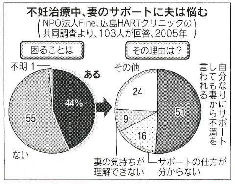 2008-07-19・・・日経より引用 ●男性も不妊の悩み 妻に気遣い・・・自分は弱音を吐けず 不妊の悩みを抱えるのは女性ばかりではない。むしろ男性は妻への気遣いから弱音を吐けず、白分の感情を押し殺しがちだ。六月に「男性が不妊を語る会」を開いた不妊症患者の自助グループ、特定非営利活動法人(NPO法人)Fineの松本亜樹子代表に男性が抱える悩みについて聞いた。 「他に何もできることがないじゃないですか、男は」。三十代後半のAさんはぽつんと、しかしはっきりとした声でそう言った。地方病院で不妊に関する講演会を終え、不妊当事者だけで「おしゃべり会」をしたときのことだ。「結局、病院に行って痛い思いや つらい思いをして頑張っているのは妻。注射とかでキッそうだなと思っても何と声をかければいいか分からない。せめて一緒に病院に行くとか、講演会に参加するとかして協力するしかない」と続けた。傍らの妻が驚いたようにAさんの顔を見る。「そんなに考えてくれていたなんて知らなかった…。彼女の目から涙が落ちた。 不妊の悩みは周囲に打ち明けづらい。徐々に世間の理解は広がっているものの、誤解や偏見がまだ少なくないからだ。そこでFlneでは二〇〇六年から女性不妊症患者が互いの体験談などを話し合い、悩みを分かち合える「わかち合いの会」などを開いてきた。カップルや夫婦での参加も呼びかけてきたが、男性はなかなか輪に入ってきてもらえなかったのが実情だ。もちろん男性も女性同様、悩みは深い。不妊の原因が主に男性にあったとしても、体外受精などの治療の負担は女性にかかりがちで、夫が「蚊帳の外」となるケースもしばしば。 三十~四十代の働き盛りに治療を始めることも多く、協力したくても忙しくてできないつらさを訴える声も耳にする。治療への温度差が生じ、夫婦仲がぎくしゃくしてしまうことも多い。妻が過去二回の流産を経験したBさん(四十代前半)は「流産になった時、言葉がなかった」と振り返る。自分も辛かったが、妻が泣いているので泣けなかった。やり場のない気持ちをもてあまし「いつまでも泣いてたってしょうがないだろう」と妻を怒鳴りつけてしまい、夫婦間に亀裂が入りそうになったこともあったという。 「子どもができない=男性失格」と思い込んで自信喪失に陥る男性も少なくない。人工授精や体外受精で精子を採取することにプレッシャーを感じる人もいる。自尊心を傷つけられ、悩みを妻にすら打ち明けられず、一人抱え込んでしまうー-。こんな悪循環が続いてしまうわけだ。そこで男性が心置きなく話せる場を設けようと企画したのが、今回の「男性が話すことが支えになるが……(「Flne」の電話相談)不妊を語る会」だ。参加者は男性の不妊体験者のみ。進行役は共同企画者である不妊専門医院、東京HARTクリニック(東京都渋谷区)め男性臨床心理士、平山史朗さんが務めた。 当日の参加者は二人。私は会場に入れなかったため詳細は分からないが、約九十分間にわたり会話が弾んだようだ。「仲間」との空間では、安堵(あんど)感からか本音がポロポロ出てきて、時には笑い声もはじける。司会を務めた平山さんは「男性は妻を気遣うあまり、『ケアする人』としての役割にとらわれすぎてしまう。相手の気持ちを優先させてしまうため、自分の苦しみやつらさには目が向かない」と指摘する。参加者のひとりは後日、同様に治療を頑張っている男性に会えたうれしさを、自分のブログでつづっていた。 悩みを話せることの安心感、抱えていたものの重さ、一緒に笑える人がいることの心強さを実感してもらえるのが「語る会」だ。今後も定期的に開催したいと思う。必要なのは本音を言葉にする勇気だ。できれば妻やパートナーに話すことが一番。それに抵抗があるなら、患者グループの集まりに参加したり、不妊治療のサイトを訪れたりして仲間を探してみてはどうか。誰かに話すことで心はこんなにも軽くなると、男性にも体感してほしい。