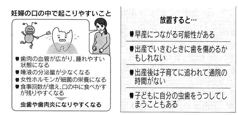 2015-04-19・・・日経より引用 ●歯の治療は出産前に 初期に検診・放置は早産リスクに 口内環境変わりトラブル多く 女性は妊娠すると歯のトラブルを起こしやすくなる。歯痛や歯茎に異変を感じても治療によるおなかの赤ちゃんへの影響を心配して、受診をためらうケースも少なくない。放置すると歯の状態を悪化させるだけでなく、早産などにつながるリスクがある。心配な場合は産科の主治医などと相談しながら早めの治療を心がけたい。 東京都在住の30代女性Aさんは妊娠6カ月を迎えた2014年末、風邪を引いてから歯が痛むようになった。今年に入り、あわてて歯科医院を受診すると、以前治療した歯の炎症が再発していた。炎症で発生したうみを取り除くなどの治療を終えたものの、おなかが大きくなってからの通院は体にも負担がかかった。レントゲン撮影によるおなかの赤ちゃんへの影響も心配だった。女性は「早いうちに歯科検診などを受けた方が良かった」とふり返る。 *女性ホルモン増加 日本歯科大学病院で妊婦の歯科治療を手がける児玉実穂医師は「妊娠すると口の中の環境が変わり、歯肉が赤く腫れる歯肉炎や虫歯になりやすくなる」と話す。妊娠の初期に感じやすい体の変化の一つに口の渇きがある。ホルモンバランスの変化で、妊娠中は唾液の出る量が減る。唾液は口の中を洗い流すため、分泌量が減ると虫歯になりやすくなる。一方、妊娠による女性ホルモンの増加で、歯の周りの組織では血管が広がり、歯肉の腫れや出血が起こりやすい状態だ。日本大学などの研究では、女性ホルモンそのものが栄養になって細菌を増加させるという結果もある。食生活の変化も無関係ではない。妊娠して腹部が大きくなるにつれて一度に食べられる量が減る妊婦が多い。 1回に食べる量を少なくして、食事の回数を増やすようになる。すると口の中に食べかすが残りやすくなり、細菌の繁殖には好都合になる。ただ、妊娠中は歯科治療を避けたり、ためらったりする妊婦は多い。治療によるおなかの赤ちゃんへの影響を懸念して、治療を後回しにしたくなるからだ。体調によっては通院も負担になる。だが、日本歯科大の児玉医師は「歯を悪くしたまま放置する方が赤ちゃんへのリスクは高くなることもある」と説明する。歯肉炎が進行して歯周炎などの重い歯周病になるとサイトカインやプロスタグランジンと呼ぶ物質が出てくる。これらは分娩の引き金になる物質と同じ作用を持つと考えられており、早産などのリスクになりかねないのだ。 *麻酔の成分も配慮 歯科治療では胎児に悪い影響は出ないように対応する。歯科医は妊娠の時期に応じて治療内容を考慮するようにしている。抜歯や麻酔を使う治療をする場合は、妊娠16週目以降の胎盤が完成した安定期に入ってから処置をする。胎児の器官形成期にあたる妊娠初期や、おなかが大きくなって治療であおむけになるのが大変になる妊娠後期はできるだけ避けている。被曝(ひぼく)の懸念があるレントゲン撮影では、腹部に鉛のエプロンをつけて覆うのが一般的。麻酔薬も帝王切開で使うのと同じ成分のものを使う。ただし、妊婦の歯の治療に慣れていない歯科医が診療を断ってしまう場合もある。 歯科選びに迷ったらどうすればよいのか。日本歯科大学病院が2010年4月に開設した妊婦の歯科治療を専門にしたマタニティ歯科外来には他の歯科で断られたり、産科の医師からすすめられたりして受診する人が多いという。同外来の代田あづさ外来長は「産科のかかりつけ医に相談したり、妊婦の歯科検診を受け入れている歯科を選んだりするのも一つの手だ」と話す。妊娠中は日々の体調管理に気を配り、出産への不安などからストレスを抱えがち。そのうえで歯科治療で通院し続けるのは負担が大きくなることもある。 妊婦の歯科検診に力を入れている横須賀歯科医院(東京・大田)の横須賀正人理事長は「妊娠が分かった早い段階で歯科検診を受けるのが大切」と訴える。母子手帳の配布と同時に歯科検診の情報を提供する自治体も増えており、積極的に活用するとよい。日ごろの歯磨きによる予防も重要だ。つわりがひどく歯ブラシを口に入れにくくなった場合も口の中で水をよく巡回させるブクブクうがいを勧める専門家は多い。口の中に食べかすが残らないようにするだけで効果があるという。母親が歯の手入れをしっかりしておくと、生まれた後の赤ちゃんに虫歯の原因菌をうつしにくくなるメリットもある。父親や兄弟姉妹なども同じだ。「妊婦さんだけでなく家族全員が歯のケアに力を入れてほしい」と横須賀理事長は話す。(出村政彬)