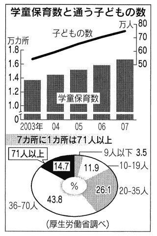 *出会い・結婚・妊娠・出産・育児・学校・教育・専業主婦・5S 2007(H19)-09-18・・・日経より引用 ●学童保育が増え続けている 学童の人数増待った 学童保育は子供たちの大事な生活の場 ゆったり過ごせる放課後を 保護者の要望強・・・施設分割、国も指針 共働き家庭の子どもたちが放課後を過ごす学童保育(学童)。希望者が増え続けるなか、良好な環境をいかに保つかが課題になってきた。人数が多すぎると、指導員の目が行き届かず、子どもたちが安心して過ごせない場合がある。保護者の声を受け、国も大人数化の歯止めに乗り出した。 栃木県小山市の南部にある間々田小学校。道を隔ててすぐのところに、この春、学区内三カ所日になる新しい学童がオープンした。十七人の子どもたちが二人の指導員と、放課後から夜六時半まで、本を読んだり遊んだりして過ごす。この地区で学童に通う子どもたちは、計約百三十人にのぼる。希望者が増え続けたため、小山市は二〇〇五年四月、二つ目の学童を開設。さらに今春、新入生が多く加わることが分かったため、運営にあたる特定非営利括動法人(NPO法人)「小山市学童保育の会」と市が協議し、急きょ三カ所目を開いた。 「先生の目も行き届き、二人の子どもはゆったり過ごしているようだ」と話すのは、会社員の柴ゆかりさん(望。市学童保育の会理事長の菊地しげ子さんは「学童は共働き夫婦の家族が求めて、わざわざ引っ越してくるほど大切な施設。市が保護者の要望を受け入れてくれてありがたかった」と話す。学童は各地で児童の大人数化が進んでいる。三カ所もある間々田は例外的なケース。「あっても一カ所」という地域が多く、希望者の増加で過大な人数を受け入れる施設が目立つ。 厚生労働省のまとめ(五月現在)では七十一人以上が通う学童は七カ所に一カ所。百人以上も珍しくない。通う人数が過大になると、指導員が多くてもけがが増えたり、疲れた子が休めなかったりする弊害が指摘されてきた。国の外郭団体「こども未来財団」の研究会も今年二月、指導員と子どもが借頼関係を結べ、子ども同士も認め合える集団規模は「四十人程度までが望ましい」とする報告書をまとめていた。人数を抑制することで子どもたちが得るメリットは大きい。〇六年四月に二カ所に分かれた「桜木げんごろう」(さいたま市)の指導員、白石節子さんによると、「以前は自分を出せずに我慢したり、同じ学年の子とだけ遊ぶ子もいた」。 しかし分割後は余裕ができ、「高学年の子が年下の子の宿題をみたり、優しく声をかけたりすることが増えた」。これまで学童の大人数化の解消は後手に回りがちだった。希望者の急増で待機児を減らすことが最優先されたためだ。また、自治体の学童への取り組みは地域差が大きく、指導員や保護者は日々の仕事に追われる。三者の足並みがそろわないと、抜本的解決には向かいにくいこともある。小山市学童保育連絡協議会会長の大高芳子さん(43)は、「当初は人数が多くても『にぎやかだな』としか思っていなかった。 娘が「行かなくていい?』と言い出して初めて、問題点に気付いた」と振り返る。「働きながらだと大変だが、保護者がみんなで芦を上げることが大切」と話す。最近では費用はかかるものの、サービスや環境が整った企業運営の学童が都市部で人気を集めている。しかし、こうした施設に通える子はわずかだ。ここにきてようやく、風向きは変わった。埼玉、岐阜、千葉などに続き、厚生労働省も学童についての初の統一的なガイドラインを策定中だ。七十一人以上の学童への補助金を〇九年度限りで廃止することも決まった。 今後は受け入れる人数の適正化はもちろん、施設の増設や指導体制をより充実させることも大切だ。2006年度から予算を大幅に増額し、民間学童の設置場所探しまで支援するさいたま市のような先駆例もある。七十五万人の子どもたちの生活の場をどう守るか。自治体、指導員、保護者の役割は大きい。