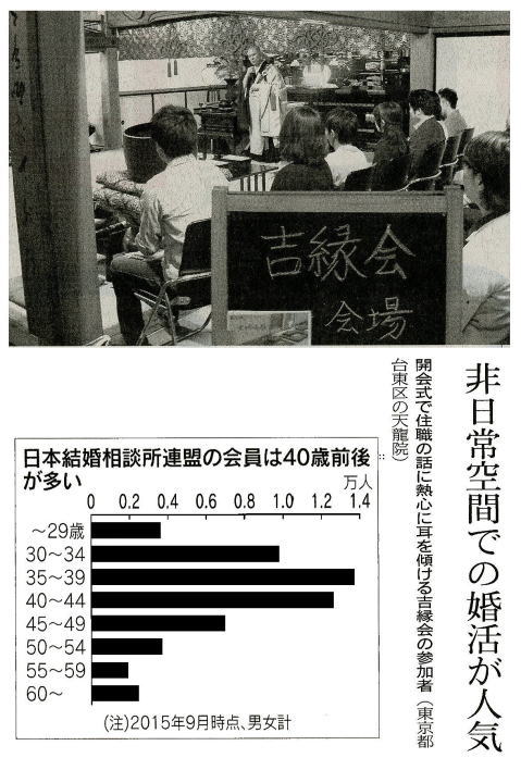 *専門の薬剤師育成 妊娠と薬について専門の薬剤師を育てる動きもある。日本病院薬剤師会(東京・渋谷)は妊娠・授乳中の女性の相談に乗り、助言する「妊婦・授乳婦薬物療法認定薬剤師」の資格を2008年度に設けた。それぞれの薬を服用する影響の有無や程度などを講義で学び、試験を経て認定される。15年10月時点で認定されたのは119人と、まだ少ない。同会は「妊娠と薬についての相談窓口が全ての病院にあるわけではない。こうした資格の認定者を増やし、気軽に相談できる体制を整えていきたい」としている。 2016-07-24・・・日経より引用 ●子育て、本能と密接な関係 親子の間に生まれるきずなの謎を脳科学から解明したい・・・黒田公美氏曰く 世に子育て本は多いが、科学的な裏付けが不明なものがほとんどだ。理化学研究所の黒田公美チームリーダーは親子のきずなの謎に脳科学で迫ろうとする。--子育てに脳がどのように関係しますか。哺乳類が誕生した約2億年前からある、本能にかかわる大切な部分が交尾、出産、子育てに関係しています。視床下部前方の内側視索前野(ないそくしさくぜんや)という数㍉㍍角の大きさの領域です。 例えば、マウスを例に見ると、メスは若いうちからよその子どもも育てようとしますが、オスは交尾前には攻撃的です。子を攻撃する未交尾のオスの脳を調べると、情動に関わる扁桃体に属する分界条床核という部分の働きが活発でした。交尾後は内側視索前野の中央部がよく働き、攻撃性が減って子育てに目覚めます。この領域を人為的に活性化しても、同様の結果になりました。 --交尾前のオスが子を攻撃する理由は。おそらく、その子を産んだメスと自分が早く交尾できるようになるからでしょう。生物にとって最終目標は追伝情報の複製です。自身がメスと交尾してできた子は攻撃せず優しく育てようとするのは、理にかなっています。子育てに関係した脳の働きは人間にも共通していると考えられます。--実の子に対する虐待もあります。幼児虐待は母親よりも父親、実の父よりも養父から受ける確率が高いという調査があります。 子の攻撃に関係した脳部位の働きが女性よりも男性で強く、養父は母と別の男性との間に生まれた子を攻撃しやすいのはマウスとよく似ています。人間の場合、自身の不幸な生い立ちのために精神面の問題を抱えているとか、子育て法がわからないといったケースも考えられます。でも、脳の神経回路の広がり方は変化し調整がきくので、改善は可能です。---子の側も、かわいがられると脳の働きに変化が出ますか。 生後6カ月以内の人間の赤ちゃんと母親12組に、30秒ごとに「だっこして座る」 「だっこして歩く」を繰り返してもらう実験をしました。すると「座る」から「歩く」に移行して約3秒で心拍数や体の動きが急減し、泣いている時間の割合は10分の1に減りました。中脳または視床下部から出た司令が、自律神経系を通してこうした反応を起こしたのでしょう。危険が迫って自分を運んで助けようとする親に、子が積極的に協力する反応だと考えられます。親と子が相互に働きかけあうメカニズムが少しずつわかってきました。(編集委員 安藤浮) 2016-10-31・・・日経より引用 ●「寺コン」が縁結び 座禅や写経一緒に仏教体験 「人柄わかり安心感」 婚活といえば、結婚相手を探すために独身の男女がパーティー会場などで談笑するのが一般的だが、最近人気なのがお寺で開く婚活、通称「寺コン」だ。座禅や写経などの仏教体験を通じ、じっくりと相手の人柄を吟味できる点が人気を呼んでいる。物欲より精神的なものを求める昨今の風潮を映し出しているようだ。 10月初旬、東京・谷中の古利、天龍院に30~40代の男女が集まった。臨済宗妙心寺派の僧侶が運営する婚活組織「首線会」 (浜松市)の東京支部が開いた寺コンだ。定員の60人が参加し、本堂は熱気に包まれた。般若心経を読経後、仏教体験へ。この日は水引作りだった。2つの集団に分かれ、男女が向かい合って座り、ひもを結び合う。結び方を教え合う光景も見られ場が和む。随時席替えをして、共同作業の顔ぶれが変わる。次のトーク時間では別の集団の異性と1人5分ずつ話をする。 プロフィル票を交換し、趣味の話などで盛り上がる男女もいた。その後、男女別に分かれ、男性部屋に女性の封簡、女性部屋には男性の封簡が置かれ、気に入った人の封簡に自分のメールアドレスを書いた紙を入れる。何人に入れてもOK。自分の封簡に入っていなくても、たくさん紙を入れれば相手からの返信が期待できる。最後に自分の封簡を受け取って終了。開始から4時間がたっていた。埼玉県から来た男性(41)は「以前参加した街コンは両思いじゃないとカップルになれなかったが、ここは片思いでも連絡が取れるのがいい。水引作りも新鮮で楽しかった」と話す。仏教に関心のある参加者も多い。 別の等の座禅会に参加したことがある東京都の女性(37)もその一人。「私と同じように仏教に興