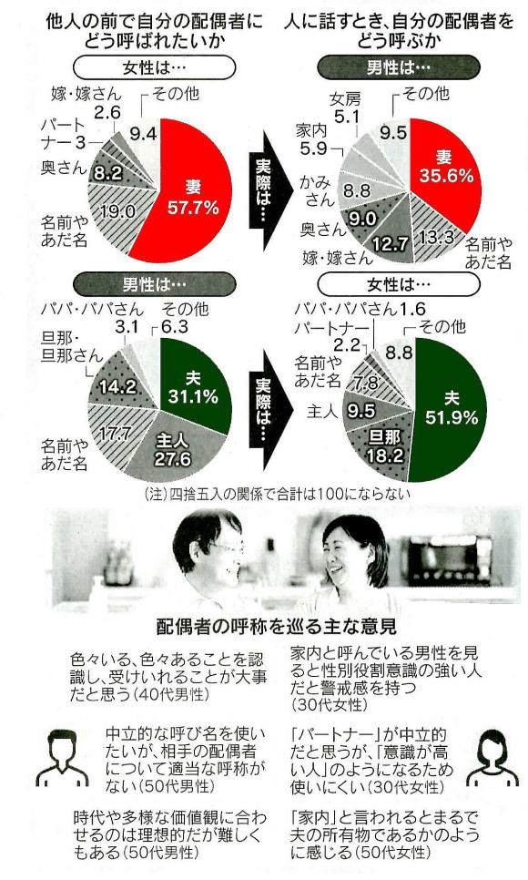 2020-08-22・・・日経より引用 ◆今を読み解く、出会いと結婚変わる慣習・次世代育成機能に課題も 過去30年、欧米では婚外子の増加、離婚や再婚の増加という形で家族の流動化が進んだ。家族の流動化に対応し、特に欧州では子どもを持つ家族への支援策を拡充した。日本では、今も家計の担い手は夫で、家事育児の担い手は妻という分乗型のカップルが夫婦の多数を占め、社会保険もこれを前提にしている。だから一見日本の家族は変わっていないように見える。ただし2010年以後、夫婦世帯では明らかな変化が出始めた。大卒層を中心に、夫婦とも正社員であっても子どもを持つ新しい家族が拡大している。ワークライフバランス政策が高学歴層を中心に成果をあげたからだろう。しかし奥田祥子氏の『夫婦幻想』(ちくま新書・19年)は、新しいタイプの夫婦の思いがけない課題を描く。育児を手伝ったため社内で出世できず、妻の出世を受け入られない夫の気持ち、子どもを持たないことを選んだかに見える夫婦の複雑な気持ちなど、長期にわたるインタビューから明らかにする。 ●乏しい子育て支援 一方で、妻がいったん専業主婦となって子を持つ世帯も依然として半数強を占める。しかしその層は以前と異なる。周燕飛氏の『貧困専業主婦』 (新潮社・19年)は子どもをもって幸せと言いつつ、夫の低い給料でやりくりに苦労する様子が描かれている。出産後の就業継続環境が改善された今、妻が無職となる層は、夫の雇用条件も相対的に脆弱な層が増えているためだろう。しかしこうした脆弱な子育て層に対して、注目も薄く、政策も不十分だ。結婚とは反対に、離婚はどうなのか。楠木俊詔・迫田さやか氏による『離婚の経済学』 (請談社現代新書・20年)は、米国で離婚が増えていった理由は女性の経済的自立であるとする。一方で日本の離婚は、女性の賃金が低いことから、いまだにそうした状況にはない。日本のひとり親世帯の相対貧困率は経済協力開発機構(OECD)の中でもっとも高く、20年前から変わらない。それは生計を立てがたいパート賃金相場が成立しており、シングルマザーの多くがこうした仕事に就き、苦境を強いられている現状を映し出す。未婚のまま中高年化する若者が増えているが、結婚の前提となる出会いは日本社会ではどう変化したのか。比較家族史学会監修『出会いと結婚』 (日本経済評翰社・17年)では、見合いが減少し、職縁は横ばいにとどまると指摘する。つまり見合いにかわる出会いが形成されていないのだ。また性別役割分業的な結婚を期待できない層では、恋愛そのものへの関心が下がり、ペット、キャバクラ、アイドルなどで親密性の感情を滴たす現象が指摘される。 ●女性活躍へ改革を 一方で、歴史研究から、見合いが出会いの中心だったというのは誤解であることも示される。確かに明治民法の施行後に家制度が庶民に浸透し、見合いが一般的になった。しかしそれ以前、農村では「夜遊び」が主な出会い方であったという。また江戸期は離婚も多く、初婚年齢も地域差が大きかったことなども示される。ところで昨年お茶の水女子大学の私のゼミ生たちと育児休業をとった正社員女性への聞き取りを行った。私は環境が改善したと思ったのだが、今後当事者となる女子学生にとってはまだまだ容易ならぬ道と見えるようだ。日本型雇用が女性を十分にそのメンバーに受け入れる柔軟性はいまだ達成されておらず、一方で依然としてパート等非正規雇用は低賃金である。 2023-03-27・・・日経より ◆「妻と呼んで」6割実際35% 中立的な表現、望む声多く 自分や他人の配偶者を、あなたはどのように呼びますか1-。男性は「夫」 「旦那」 「主人」、女性は「妻」 「嫁」 「奥さん」 「家内」 「女房」 など日本語には配偶者に関する表現がいくつも存在するが、どのように呼ぶのがふさわしいのだろう。日経ウーマノミクス・プロジェクトが実施したアンケート調査から、配偶者の呼び方に関する悩みを探った。 調査は2月に実施、「配偶者の呼び方」について男女1584人から回答を得た。自分の配偶者を誰かに説明するときの呼び方について、女性では「夫」が51・9%と最も多く、「旦那」 (18・2%) 「主人」 (9・5%)を大きく離した。男性では「妻」が35・6%と最も多い。文化庁が1999年に行った国語に関する世論調査では、自分の配偶者について既婚男性の51・1%が「家内」と呼んでいた。また既婚女性では74・6%が「主人」と呼んでいたことも踏まえれば、使われる呼称は大きく変化していると考えられる。ただ、他人の前で配偶者に何と呼ばれたいかとの問いに、57・7%の女性が「妻」と答えており、実際の呼ばれ方との差もみられる。男性は31・1%が「夫」、27・6%は「主人」と答えている。知人や同僚など他人の配偶者をどう呼ぶかについても悩みが多い。 男性の配偶者についての呼び方では「旦那さん・旦那様」が53・5%、女性の配偶者では「奥さん・奥様」が84.7%と、自分の配偶者への呼び方と