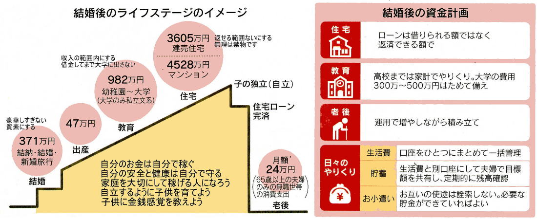 まず、人生の三大支出「住まい」 「教育」 「老後」について計画したい。損得ではなく、どのような暮らしをしたいかを念頭に夫婦で一緒に考えていこう。住まいは賃貸か持ち家か。賃貸は収入や環境などの状況に応じて適切な場所へ移り住むことができる身軽さが魅力だ。設備の故障や被災時の修繕も大家が負担するため住宅維持費も不要で、必要な資金は一生分の家賃だ。場合によっては更新料がいる。老後も長く働いて収入を得るか、年金や貯金から払い続けられるように暮らしぶりを縮小する工夫をしておきたい。高齢になれば契約や更新ができなくなるおそれもある。親から相続した家に移る、最終的には家を購入するなど終の棲家を確保する計画があるならより安心だ。持ち家は家へのこだわりを存分に反映でき、おうち時間をより楽しむ環境を整えられることが魅力だ。 老後も住むには困らない。利便性の良い土地を選べば、ある程度資産性も維持できる。一方、定期的に修繕費がかかる。住宅金融支援機構の2021年度の調査では、必要な資金は全国平均で土地付き注文住宅4455万円建売住宅3605万円、マンション4528万円、中古戸建2614万円、中古マンション3026万円。住宅ローンを組む場合、手取りから返済額を引いた残りで生活できるかどうか、将来に備えて積み立てできる額も含めて考えよう。教育は公立か私立か。いずれにしても、ためて備えるのは大学費用とし、高校までは毎月の収入などから捻出したい。文部科学省の21年度の試算では、幼稚園から高校までの15年間の学習費総額は全て公立で574万円、全て私立で1838万円。単純に割り算すると公立は月3万円、私立は月10万円程度だ。 うち公立の6割、私立の4割弱は塾など学校外費用。家庭で調整しながらやりくりしよう。大学4年間の総額は国公立250万円前後、私立文系408万円、私立理系540万円。子どもが将来、希望する進路は分からないが、17歳までに300万円、できれば500万円程度はためておきたい。初年度の納入金は早ければ推薦やAO入試の場合、高校3年の秋は納めるからだ。児童手当と合わせて積み立て、保険で備えるときも17歳以前の満期にしよう。妊娠・出産・育児の序盤は夫婦の働き方が大きく変わるタイミングだ。思うように貯金が進まないことも考えられる。子どもを授かる前から余裕をもって積み立てを開始できればより安心だ。 老後資金は個人型確定拠出年金(1DeCO)や少額投資非課税制度(NISA)といった非課税制度を利用し、運用により増やしながら積み立てる方法がベストだ。必要な資金は人により違い、結婚してすぐの若い夫婦には現時点で老後の正確な計算はできないのが現実だ。余計な不安は持たず、今の生活を大切にすることを第一に考える。家計の支出を下げ、収入を上げる努力をし、少しでも運用にまわすことができればよい。日々のやりくりは収入-貯蓄=支出が基本。貯蓄を確保しつつ、家計が破綻しないようにしたい。貯蓄は生活費口座とは別にして着実にためる。夫婦で目標額を共有し、定期的に残高を確かめ合う。支出は限られた範囲で生活を豊かにしたい。 生活費の口座は一つにまとめれば一括管理しやすく無駄遣いもわかりやすい。生活水準を落とさず節約できる生命保険料などの固定費は見直し、日々の生活に影響を与える光熱費などの変動費はマイペースに調整する。節約のコツは支出を減らしても満足度は下げないこと。これだけあれば生きていけるという基準を低く抑えることができれば、そのぶん暮らしにゆとりを生みだせる。夫婦といえとも考え方や捉え方は違って当然だ。だからこそ夫婦一緒にライフプランニングに取り組む必要がある。共通認識を持って互いに支え合うことは円満な家庭生活を長く続けていくことにもつながるだろう。(ファイナンシャルプランナー森 文子)
