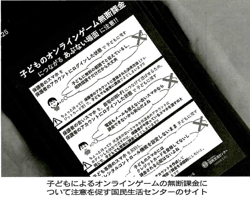 2024-03-19・・・日経より ◆子のゲーム課金、請求届いて仰天 スマホ普及で相談増機能制限など呼びかけ 親の目盗み、100万円の事例も 子どもが無断でオンラインゲームに課金したという相談件数が年間4000件に達している。平均決済額は約33万円で、100万円を超えるケースもあった。親のアカウントでログインしていると、未成年者を理由とした契約解除が難しい場合がある。国民生活センターはスマートフォンの機能制限などの対策を呼びかけている。「お金がかかると分からず、息子が課金をしていた」。東海地方に住む40代の母親が2023年2月、地元の消費生活センターに相談を寄せた。父親が使わなくなったスマホで遊び、オンラインゲームに2日間で約10万円を課金していた。 父親は自宅のWlIFl環境で無料の動画を見られるよう、4桁の暗証番号を息子に教えていた。決済方法としてクレジットカードを登録。課金に必要なパスワードは息子が自ら再設定した。親は利用料金の請求が層くまで気づかなかっだという。国民生活センターの集計によると、小中高生のオンラインゲームに関する相談は年々増えている。22年度は4024件で18年度(1995件)から倍増しだ。23年4月~24年1月は約3100件で、前年同期の相談件数を約200件上回る。22年度の内訳は小学生が半数を占めた。 大半は「子どもが親に無断で課金していた」との内容だった。相談事例の平均決済額(22年度)は約33万円で、100万円を超えるものも6・5%あった。スマホの普及に伴い、オンラインゲームで遊ぶ子どもは増えている。23年度の内閣府の調査によると、5歳児の8割がインターネットを利用していた。小学生(m賎以上)の利用目的は「動画を見る」 (90・5%)や「ゲームをする」(87・5%)が上位にある。親も対策を練る。大阪府の女性(44)は知人の子どもが勝手に10万円の課金をしたと聞き、7歳の娘がスマホやタブレット端末を使う際は親だけが知るパスワードを入力するようにした。 16歳の息子を含め決済をすれば親にメールが届く設定もした。それでも子どもが小遣いでプリペイドカードを購入し、ゲームの決済をしたことがあった。「メール設定をしなければ気づかなかった。コントロールが難しい」と話す。ゲームに熱中する余り、親の対策をかいくぐる子どももいる。国民生活センターによると、40代の母親の古いスマホを使っていた小学生の息子が、課金に必要な指紋認証に自分を追加して設定し、約5万円を決済した例がぁった。指紋認証を追加する方法は友人に教わったという。 民法は保護者の同意なく未成年者が結んだ契約を解除できる「未成年者取消権」を定める。子どもが勝手にゲームで課金をした場合、決済情報を持つアプリストアの運営会社に申し出て契約解除を求めることができる。だが、スマホゲームは取り消しのハードルが高い。保護者のアカウントでログインした端末で課金すると「保護者が決済した」とみなされる場合があるからだ。国民生活センターの担当者は「アプリストアの聞き取りなどを踏まえて取り消しの可否が判断されるが、子ともが勝手に使ったことの証明が難しい」と説明する。 ゲームの運営会社に返金を求めた場合は、海外拠点の企業が多いことが壁になる。日本オンラインゲーム協会(東京・新橋)が消費生活相談員からの相談を集計したところ、3割は海外の運営会社が絡んでいた。外国語でやりとりする必要があるほか、そもそも連絡が取れないケースも少なくない。国民生活センターは勝手な課金を防ぐ手立てとして、子ども専用のアカウントを作る▽子どもが使うスマホにクレジットカード情報を登録しない▽顔認証などで決済を承認する設定にするなどの方法を挙びている。アプリのダウンロードや課金方法を制御する「ペアレンタルコントロール機能」の活用も有効だという。(田辺アリンソヴグラン)