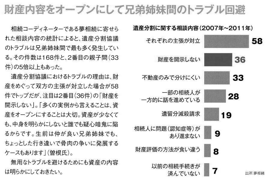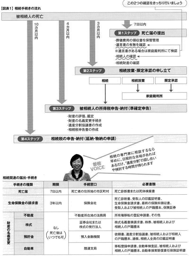 | 夫婦・相性・性格・ひきこもり・相続・管理 2012-01-**・・・日経マネーより引用 ●相続&遺言 ■相続 ◇続手続きは4つのステップで進んでいく 「うちは資産家じゃないから相続は関係ない」という人がいますが、それは大きな間違い。財産の多い少ないにかかわらず、亡くなれば相続は発生します。言い換えれば、誰もが相続トラブルに巻き込まれるリスクがあるわけです。相続によるトラブルへの備えとして、一連の手続きはどのように進んでいくのかを確認しておきましょう。相続の手続きには大きく4つのステップがあります【図表1】。第1ステップは「死亡届の提出」、第2ステップは「相続放棄・限定承認の申し立て」、第3ステップは「被相続人の所得税申告・納付(準確定申告)」、第4ステップは「相続税の申告・納付(延納・物納の申請)」です。 第1ステップでは遺言書の有無がポイントになります。遺言書はあったものの、公正証書でなかった場合は、被相続人(故人)の最後の住所地を管轄する家庭裁判所で遺言書の検認手続きを行います。遺言書がない場合は、財産を分ける話し合い=遺産分割協議を相続人の間で行います。財産が相続税の対象になる場合は、10カ月以内に相続税の申告・納付をしなければなりません。これが最後の第4ステップです。それまでにすべての財産を評価することになりますが、理想は3カ月以内に確認しておくこと。早めに相続税申告や納税が必要か不要かを知ることで、その後の手続きが違うからです。