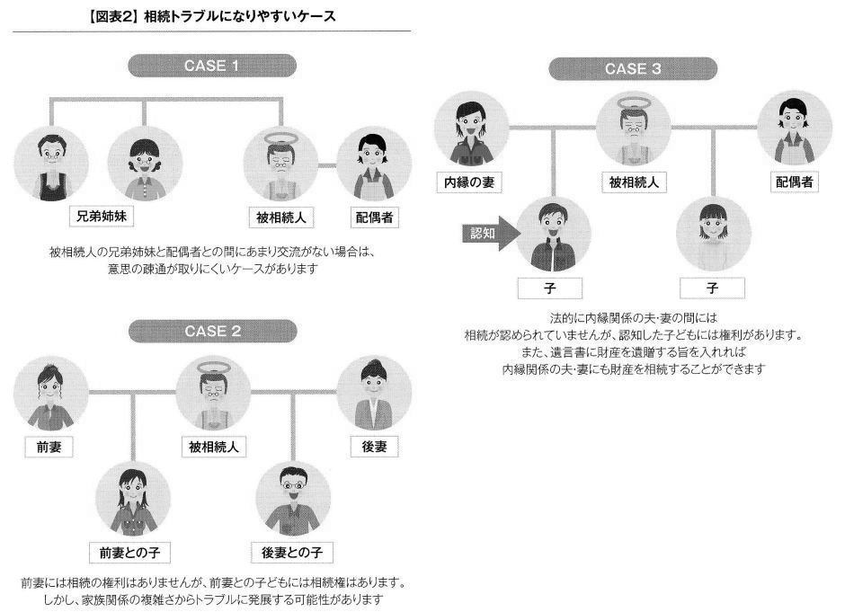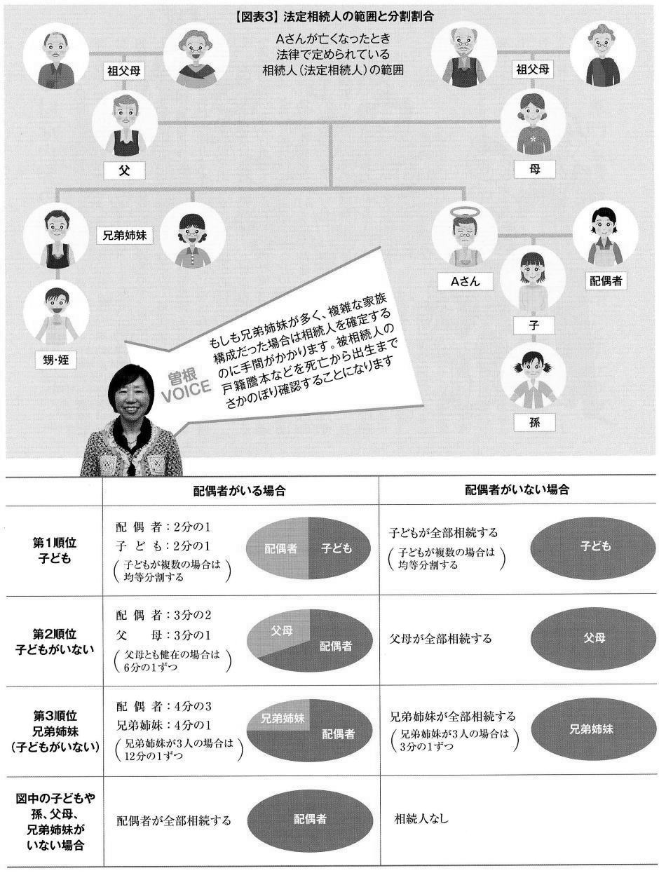 ◇則、相続人になれるのは配偶者と血族のみ 「相続人の確定」もきっちり行いましょう。遺産は身内であれば誰でも相続できるわけではありません。遺言書がない場合や法的に遺言書が有効でない場合は、法律で遺産を相続できる人(法定相続人)や順番、取り分が定められています。法定相続の順位は配偶者が常に相続人となり、これに加えて直系卑属である子どもや孫が第1順位となります。つまり配偶者と子どもがいる場合は、それ以外の血族の人は相続人にはなれません。子どもがすでに亡くなっている場合は、その子ども(被相続人から見ると孫に当たる)が相続人となります。 これを代襲相続といいます。子どもや孫が存在しないときは、直系尊属である被相続人の父母が相続人となります。被相続人の父母が亡くなっている場合は祖父母です。第2順位も亡くなっている場合は、傍系の血族である兄弟姉妹が相続人となります。養子縁組をしていれば実子と同じように相続の権利があります。婚外子などの非嫡出子の場合も父親から認知を受けていれば、実子や養子と同様に第1順位の相続人になります(ただし、相続分は嫡出子の2分の1です)。