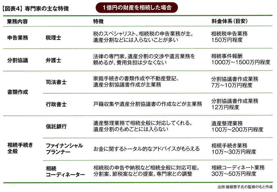 ◇門家選びでは「実績」をチェック 円満・円滑な相続を目指す場合〝相続の専門家″は心強い存在です。しかし、人選を誤ると金銭面のマイナスだけでなく、感情面で大きなしこりを残す恐れもあります。専門家選びで陥りやすい落とし穴は、今までの顧問税理士など身近なところで安易に依頼するパターン。相続のスペシャリストならばよいのですが、成果が出ない可能性もあります。相続の実績演があるかどうかは要チェックです。実際に話を開いてみるのも大事なポイント。相談しにくい相手だったがゆえに、不満が残るケースも見られます。相続にはさまざまな専門家がいます。それぞれの特徴、料金体系を下記の図表にまとめました。専門家選びの目安にしてください。