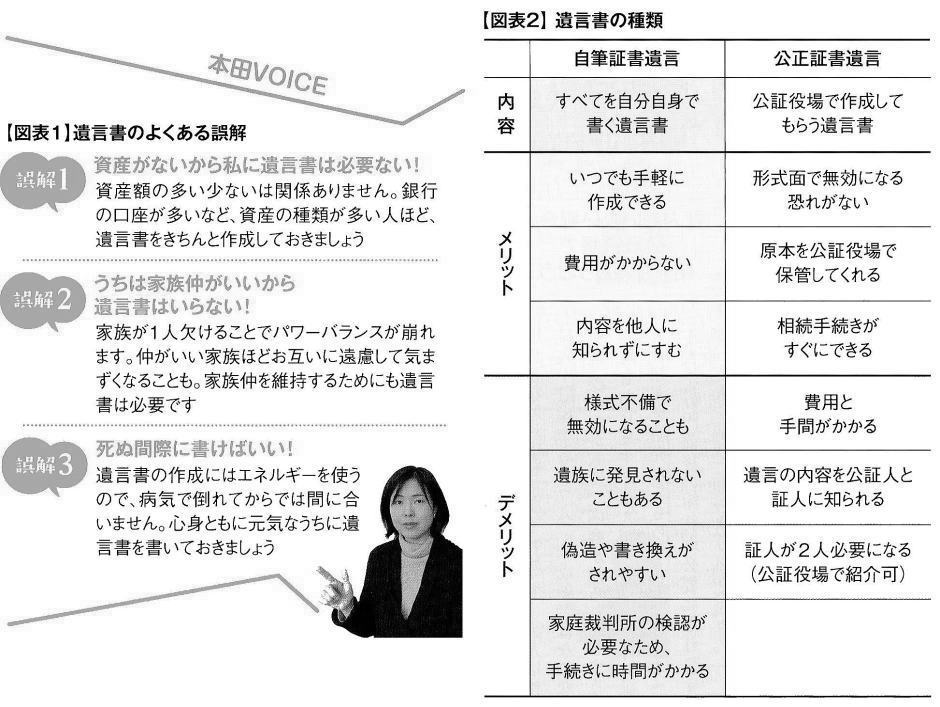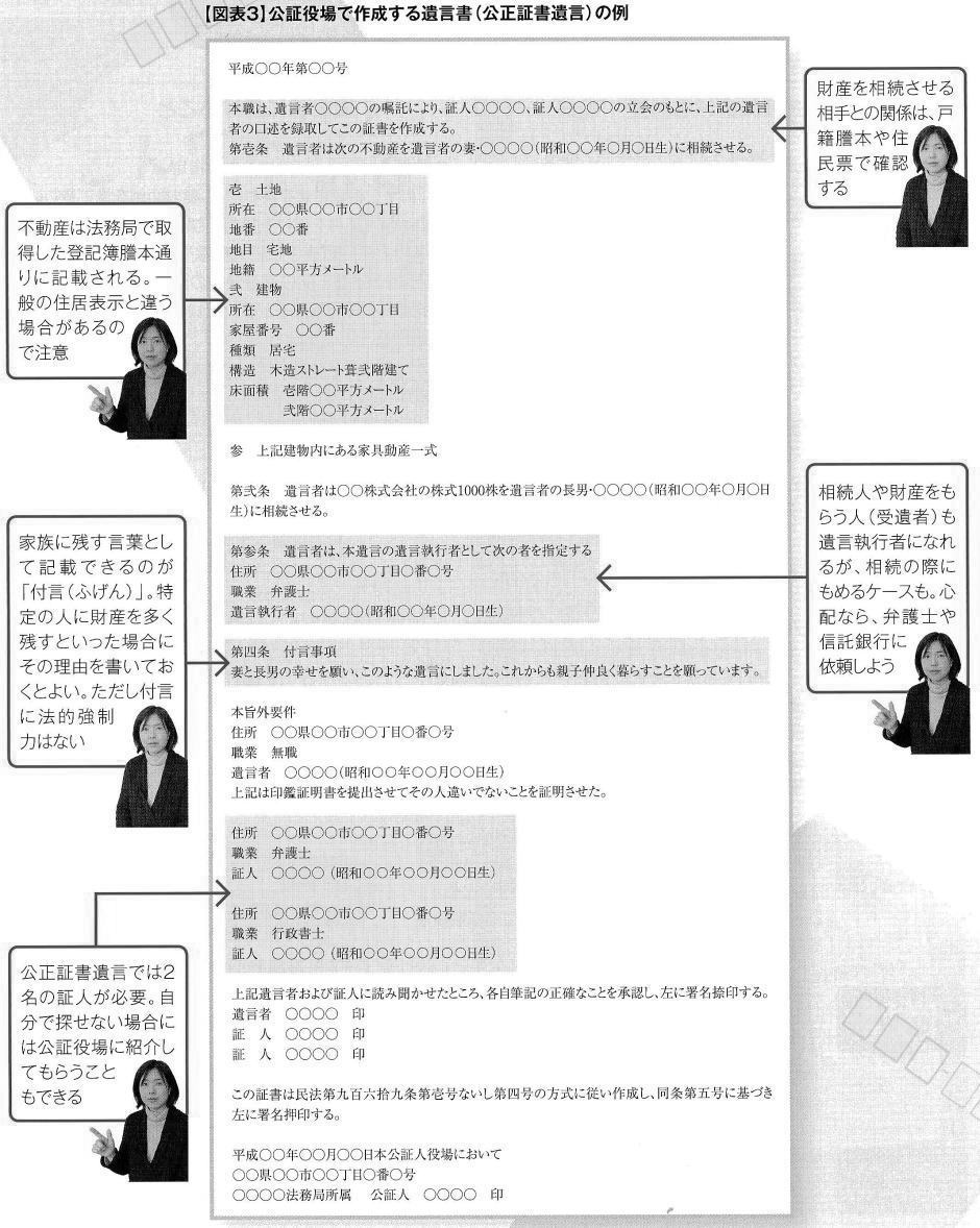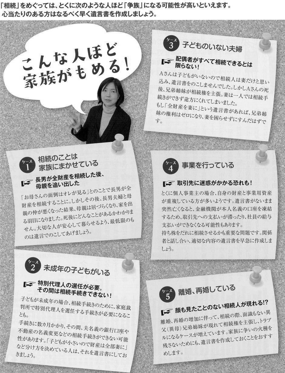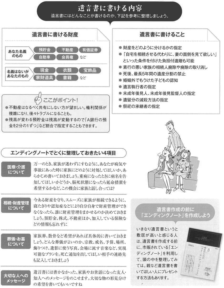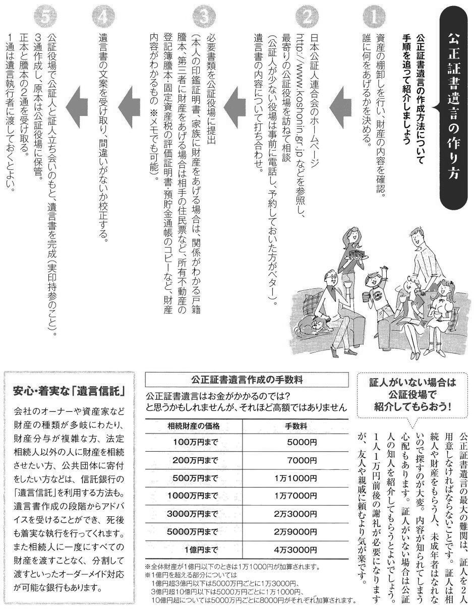 ■遺言 できれば定年前には作成したい残された宗族に負担をかけないために早めに正式な遺言書を。「私には遺言書は関係ない」と思っていませんか?遺言書を作成していなかったために、相続が「争族」になってしまうケースが増えています。家族のためにも、元気なうちに遺言書を作っておくことが大切です。 ◇遺言書があればスムーズに相続手続きできる 「うちは財産がないから遺言書はいらない」「家族仲がいいので相続でもめることはない」 -。多くの方が遺言書の必要性を感じていないのが現状のようです。経済産業省の「ライフエンディング・ステージに関する意識調査」によると、遺言書を作成している人はわずかl・7%という結果も出ています。遺言書とは単に家族への思いを書く〝手紙″ではなく、相続手続きをスムーズに進めるための書類です。遺言書がないと残された家族には大きな負担になることも。家族のことを思うのなら、なるべく早めに、できれば定年退職前には遺言書を作成しておくべきでしょう。 ◇誤解」だらけの遺言書知識 「遺言書がいるのはお金持ちだけでは?」。そんな疑問をもつ方もいるかもしれません。今、あなたのお財布に銀行のキャッシュカードが何枚入っていますか?証券会社などの取引口座はいくつ持っていますか? 財産が少なくても、口座数が多ければ、それを引き継ぐだけでも家族に大変な手間がかかります。遺言書を残しておけば、こうした手続きがスムーズになり、家族の負担が大幅に軽減されるはずです。「遺言書がなくても法定相続分にしたがって分ければ問題ないのでは?」というのも誤解です。例えば財産がマイホームしかない場合、そこに妻が1人で住んで いるのを法定相続分通りに分けようとすれば、家を売却して妾と子どもで分けるといった非現実的な話になってしまいます。 また、法定相続分は一つの目安にすぎず、現実には残された家族の話し合いで決まります。するとどうなるか。発言力のある人が一番有利になってしまいます。大切な人を守りたいなら、きちんと財産分与を指示しておくべきです。遺言書を作成することは自分のためにもなると言われています。遺言書を作る過程で、自分の資産がいくらあるのかが正確にわかります。現状の資産把握は残された人生を満喫するための第一歩。また自分にとって誰が大事なのか、人間関係を見つめ直すきっかけにもなります。今後、誰に一番お世話になるのか。相手にどんな財産をのこすべきかなど、老後の生活を具体的にイメージできるようになるでしょう。 ◇自筆の遺言書も無効になることも 遺言書は、自分自身で書く「自筆証書遺言」と、公証役場で作成する「公正証書遺言」の2種類に大別できます。自筆証書遺言は紙とペンと印鑑があればすぐにでもできます。「遺言書」という場合、一般的にはこの「自筆証書遺言」を思い浮かべる人が多いようです。しかし、自筆証書遺言では遺言の内容が執行されない可能性も。法律的に正しい用語が使われていないなどの理由で無効になったり、相続手続きができないことがあります。例えば相続させる家族の名前は戸籍名で正確に書く必要があります。「○○ちゃん」といった愛称だと第三者にはわかりません。また、自筆証書遺言の場合、見つけた家族が自分に都合が悪い内容だと破棄してしまったり、改ざんするケースも見られます。 保管場所がわからず家族が遺言書を発見できないこともあります。遺言を確実に執行してもらうには「公正証書遺言」の方が安心です。多少、手間とお金がかかりますが、最寄りの公証役場に相談すれば、親切にアドバイスしてもらえるはず。公正証書遺言なら、①形式面で無効になる恐れがない、②原本を公証役場で保管してくれるので紛失する心配がなく、遺族によって改ざんされるおそれもないなどのメリットがあります。あやふやな遺言書はトラブルの元。家族の幸せのために、また豊かなリタイア生活を楽しむために、退職前の50歳代になったら、遺言書を作っておきましょう。