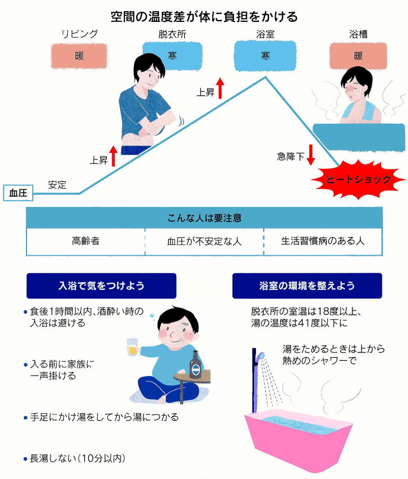 2019-01-12・・・日経より引用 ◆ ヒートショック冬に多い、廊下・脱衣所などを床暖にしよう 急激な温度変化避けよう、 「お風呂は41度以下/脱衣所・トイレ暖かく」 そのような事に気をつけて新築しよう! 底冷えする季節は、家の中の寒暖差が大きくなって血圧が乱高下し「ヒートショック」が起きやすくなる。入浴時の転倒や失神、脳梗塞などの原因になる。室内でも防寒対策を心がけて、事故を防ごう。 ヒートショックとは、急激な温度変化で血圧が大きく変動し、体に負担がかかって体調不良に陥ることを指す。意識が低下するほか、脳出血や脳梗塞、心筋梗塞などの原因にもなる。症状が重いと死に至る危険もある。10月から4月は、狭心症や心筋梗塞などによる心停止の事故が増えるという報告もあり、背景としてヒートショックが考えられている。多摩平の森の病院(東京都日野市)の高橋龍太郎院長は「冬場は特に、ヒートショックによる入浴関連の事故が急増する」と注意を促す。東京都健康長寿医療センター(東京・板橋)の2011年の調査によると、年間約1万7千人が入浴中の心肺停止で救急搬送されていた。 月別に見ると、1月の件数は最も少ない8月の11倍に上った。暖かい部屋で過ごした後、入浴しようと室温の低い脱衣場で服を脱ぐと、血管が収縮して血圧は上昇する。寒い浴室に入ったり、急に湯につかったりすると、刺激で血圧はさらに上昇する。風呂でしばらく温かい湯につかるうちに、今度は血管が拡張し、血圧は急降下する。このとき意識を失って浴槽内で溺死することが、冬場の入浴時の事故の主な原因と考えられている。ヒートショックが起こるのは入浴中に限らない。小田原循環器病院(神奈川県小田原市)の杉薫院長は「夜間寒いトイレに行くとき、朝新聞を取りに屋外に出るときなどむ血圧が変化しやすい」と話す。 発生リスクが高いのは血圧の調整機能が低下しがちな高齢者など、血圧が不安定な人。糖尿病や高脂血症など生活習慣病のある人も要注意だ。高橋院長は「ヒートショックは若く健康な人でも起こることがある。自分は大丈夫と過信せずに、生活環境の温度差を意識し、対策を取って」と助言する。室温が下がりやすく注意が必要なのが、肌の露出が多くなる浴室やトイレなど。脱衣所の室温は小型の暖房器具などを使って18度以上にする。シャワーで熱めの湯を高い位置から浴槽に注ぐと、蒸気の働きで浴室内を20度前後に暖めることができるという。湯温は41度以下に保つ。「42度と41度では、体にかかる負担がかなり異なる」 (高橋院長)。温度調整ができない場合は、湯温計を使おう。入浴方法にも気を配りたい。浴槽に入る前にかけ湯をして、湯に体を慣らす。湯につかる時間は1回10分以内に。浴槽では急に立ち上がらないようにして、立ちくらみを防ぐ。 食後1時間以内や飲酒後の入浴は避ける。一人等の場合は、周りに人がいる公衆浴場や日帰り温泉を使う手もある。入浴後は湯冷めに注意。気温が下がり過ぎない日没前に入浴するのも有効だ。杉院長は「寒い場所に移動するときは、スリッパや厚手の靴下をはくなど体を冷やさない工夫が大切。体表近くに太い血管が通る首筋は冷気の影響を受けやすい。屋外に出るときはマフラーを巻くなどの対策を取って」と話す。日本気象協会(東京・豊島)と東京ガスが共同開発し、インターネットで公開している「ヒートショック予報」も参考になる。全国約1900地点の7日先までのヒートショックリスクを5段階で示している。リスクの高い日は脱衣所の室温や浴槽の湯塩などに十分注意する。高齢の親など離れて暮らす家族にも電話などで一声かけると、事故防止につながる。(ライター荒川 直樹)