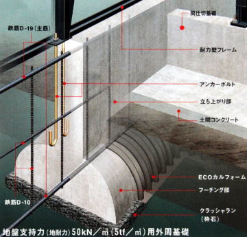 土台を不用としている構造が特徴であり、土台を介さず、鉄骨フレームをアンカーボルトによりダイレクトに基礎と堅結している。このため、建物が地震などの外力を受けた場合に、その力(エネルギー)を理論どおりダイレクトに基礎に流すことが可能である。