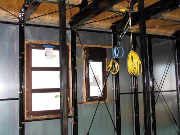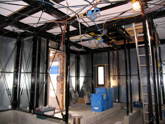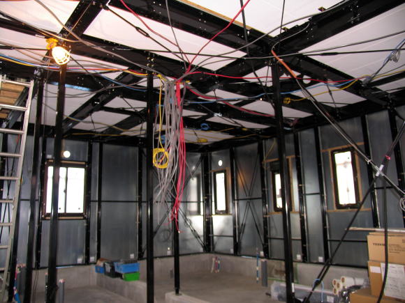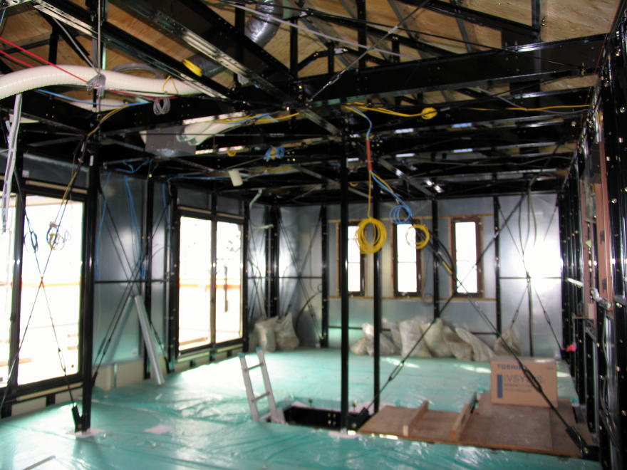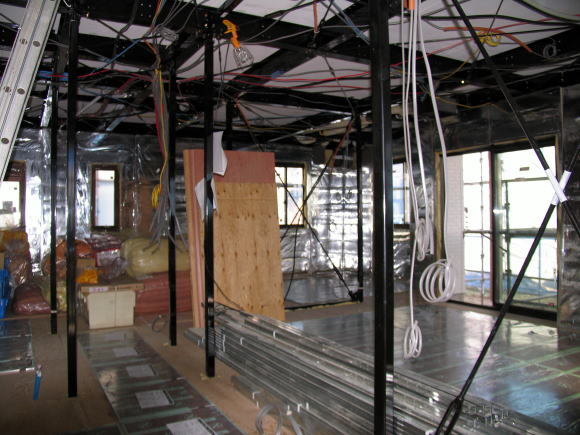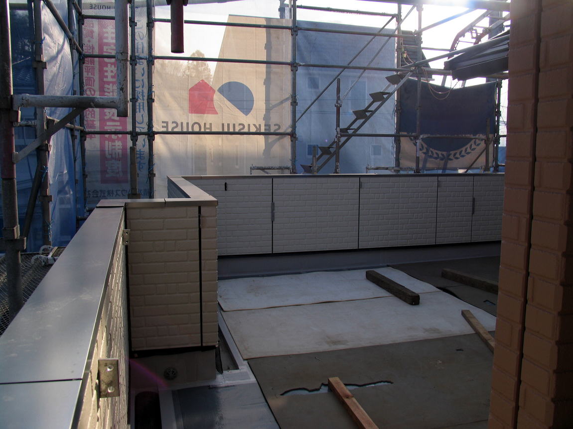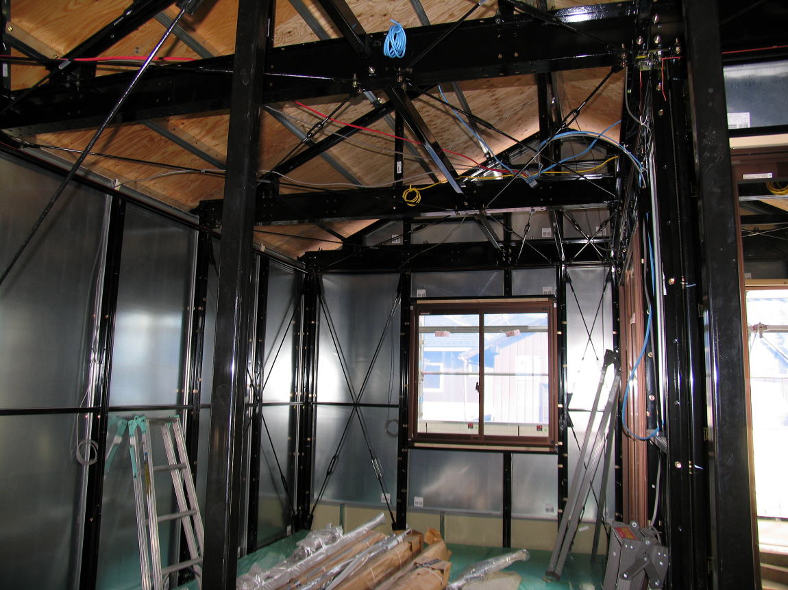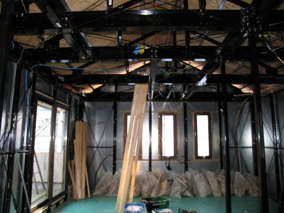 建方から時々工事中の室内見学で、海上に浮かぶ氷山の一角のようなポカミス的な箇所、天上板(野地板)の歪み・室内全体の埃・鉄骨の凹み・鉄骨の汚れ・鉄骨塗装の剥がれ・防湿シートの破れ・合板床パネルのササクレ・釘打ちミス・天板(補強板)の足跡・濡れた染み、等を気にしながら時が過ぎて天候もまずまずの青空の下で3月15日に足場が撤去された。