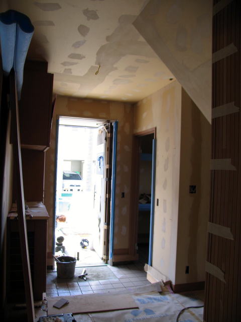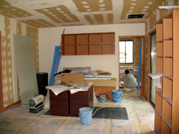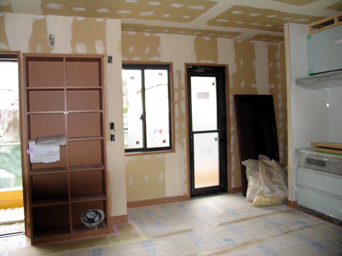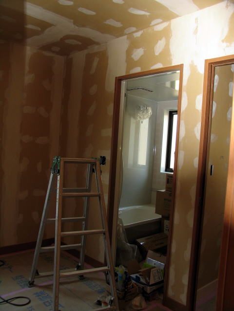 我が家の新築に1時間20分程で着いた。工事関係者の人達に ご挨拶して室内に入らせて頂き見て回った。工事はかなり進んでいたが石こうボードを研磨したためか